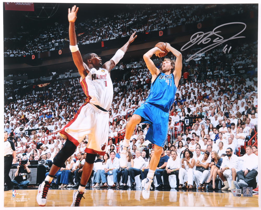 Photo measures 16" x 20” in size and has been hand-signed by Dirk Nowitzki (Dallas Mavericks).