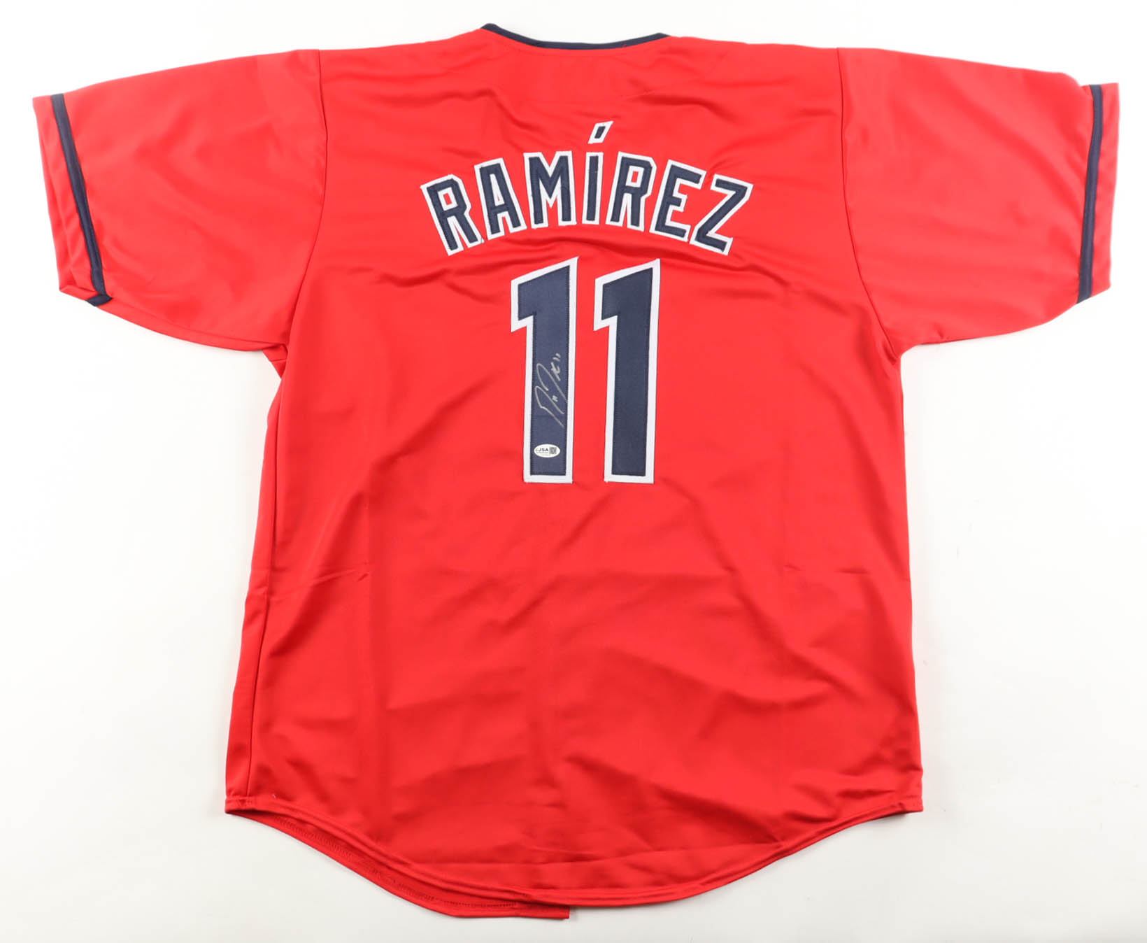 Custom jersey with everything sewn on, size XL. Hand-signed by José Ramírez.