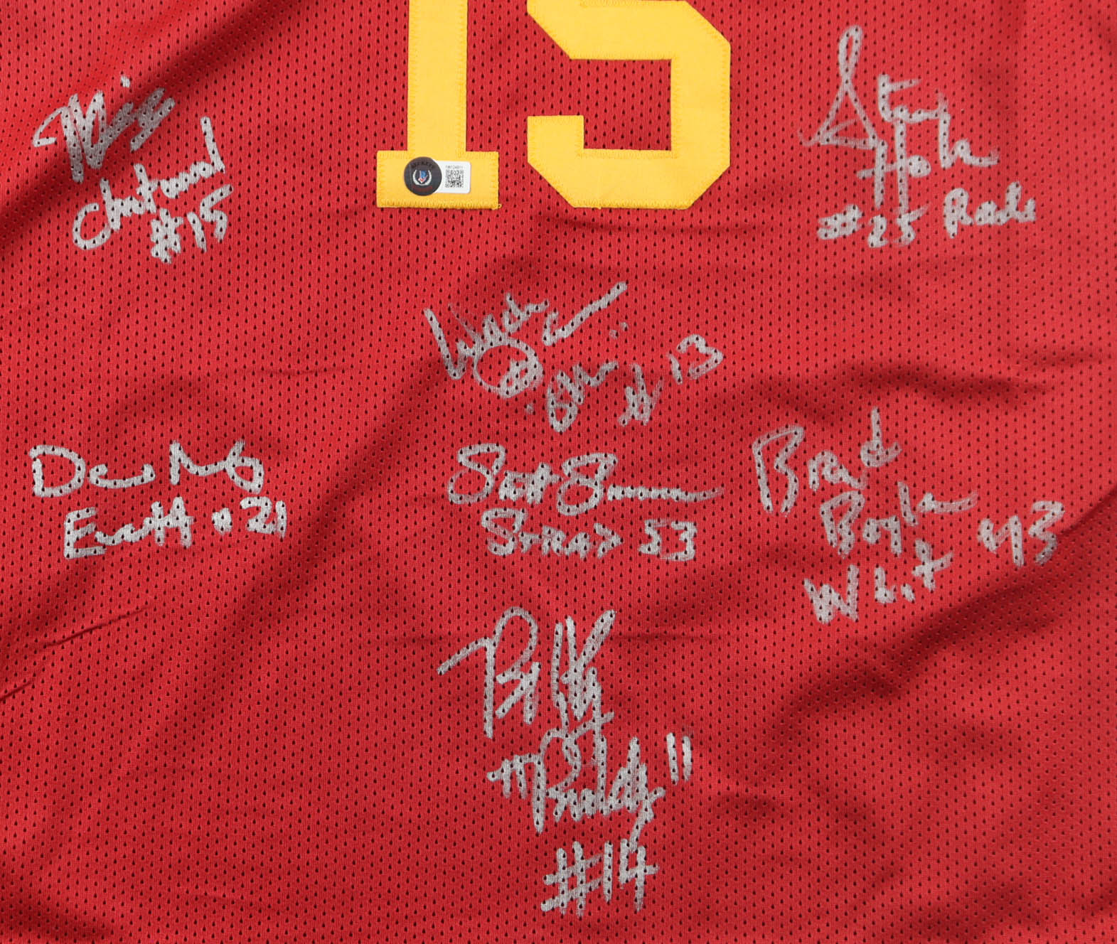"Hoosiers" Jersey Cast-Signed by (7) with Maris Valainis, David Neidorf, Scott Summers, Brad Long with Character Inscriptions (Beckett)