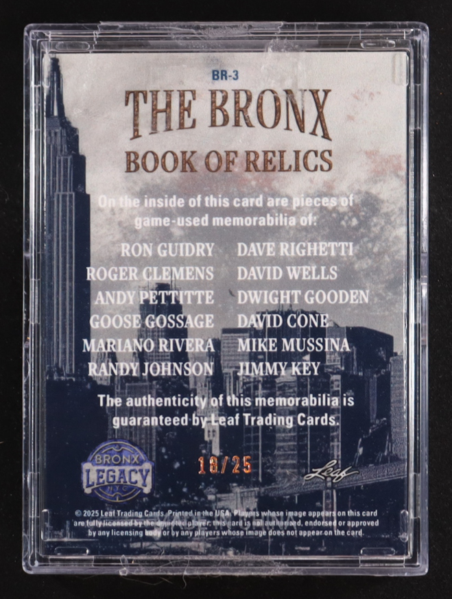 2025 Leaf A Bronx Legacy Book of Relics Bronze Game-Used #BR-3 #18/25 Ron Guidry / Roger Clemens / Andy Pettitte / Goose Gossage / Mariano Rivera / Randy Johnson / Dave Righetti / David Wells / Dwight Gooden / David Cone / Mike Mussina / Jimmy Key