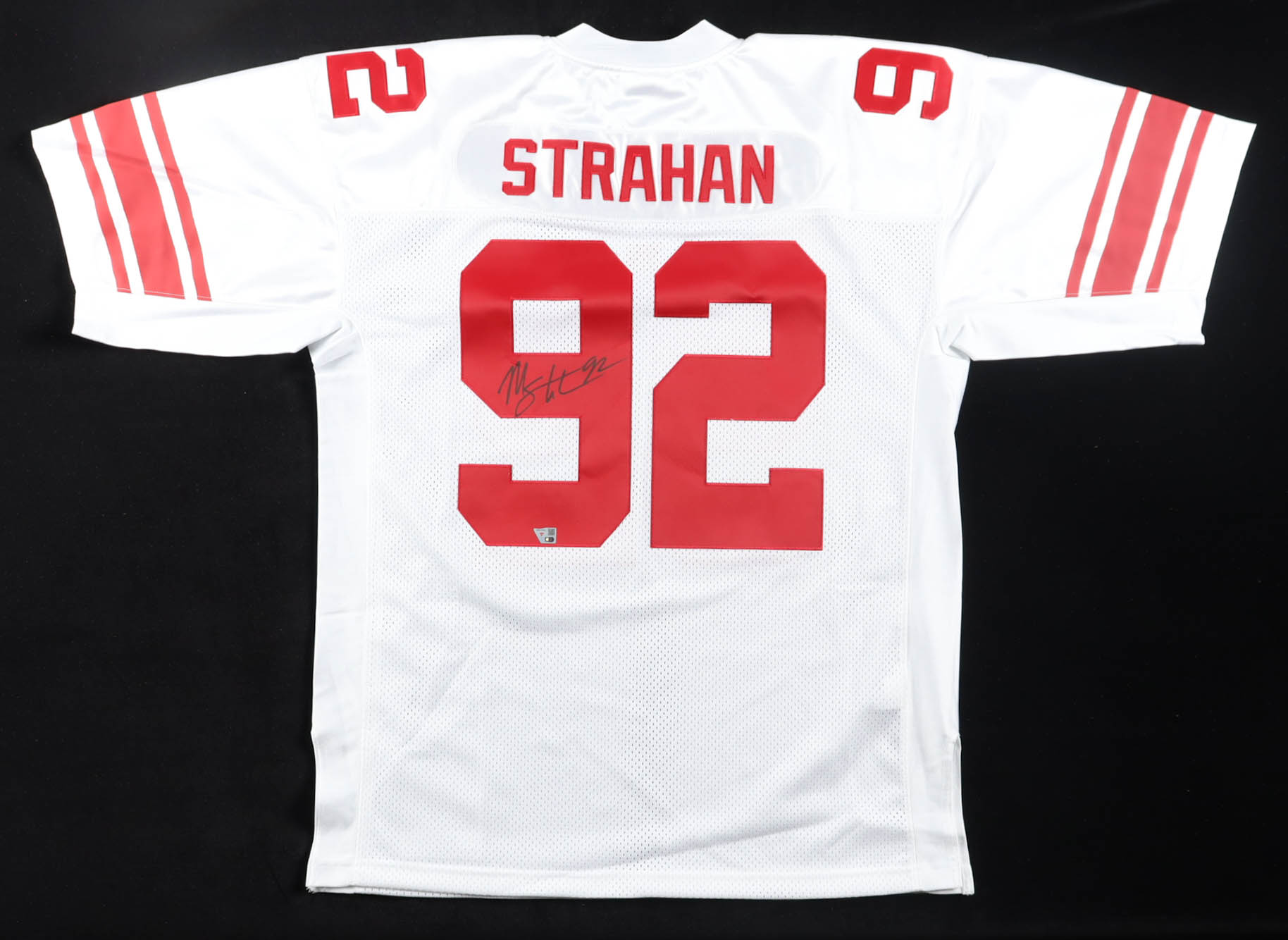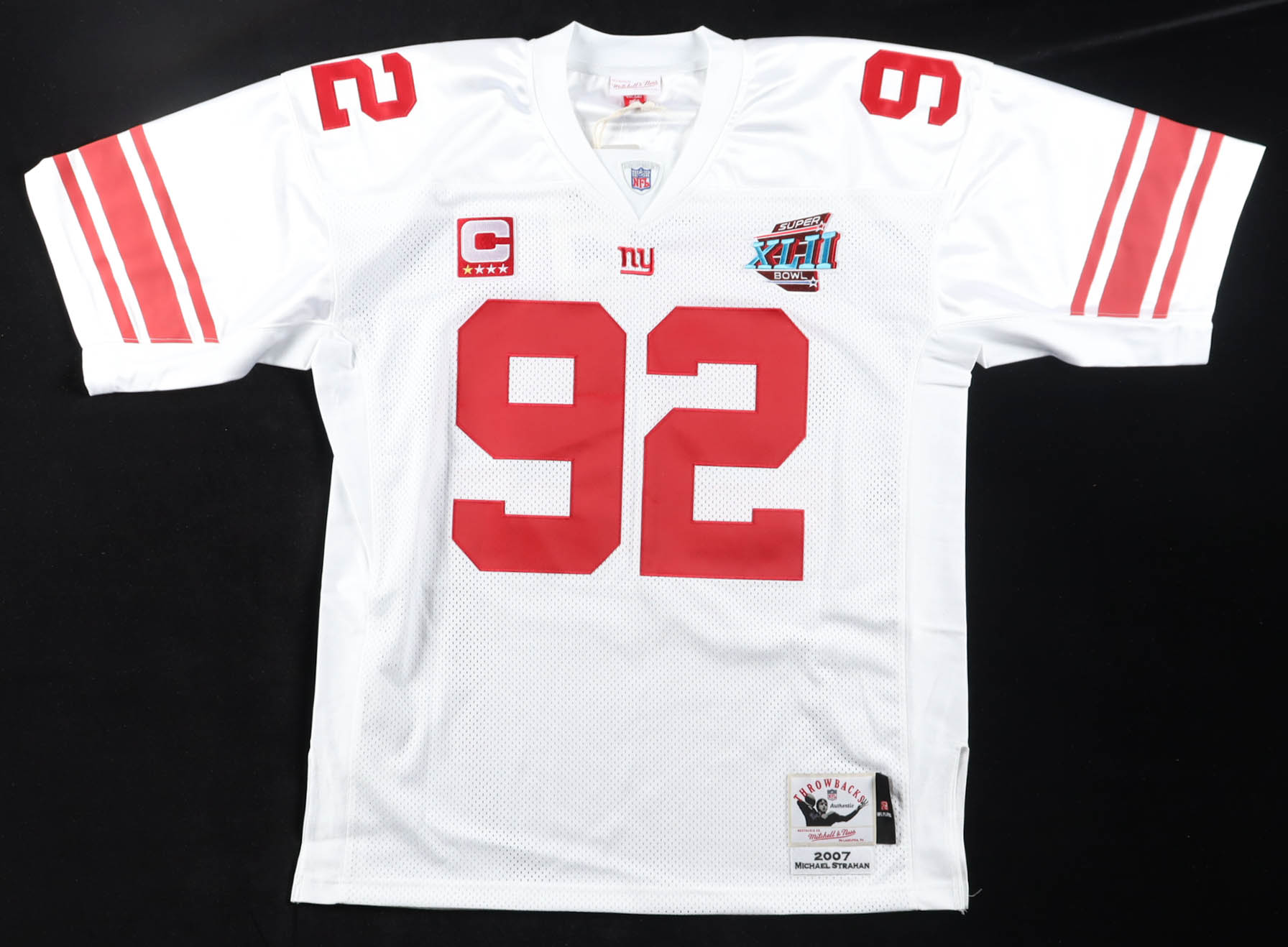 Mitchell & Ness jersey with everything sewn on, size 48 (XL). Hand-signed by Michael Strahan (New York Giants, HOF).