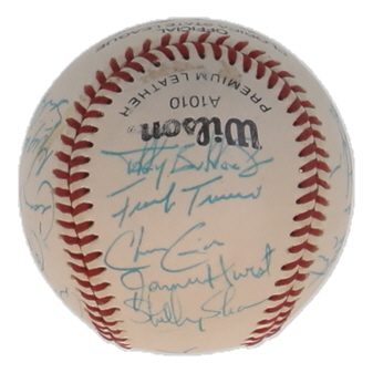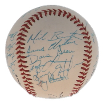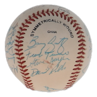 Wilson Florida State League baseball. Hand-signed by (21) members of the Charlotte Rangers including: Bump Wills, Tony Bouton, Larry Hanlon, Dave Geeve, Roger Luce, Mike Burton, Sid Holland, Craig Newkirk, Dave Lowery, James Hurst, Frank Turco, Terry Burrows, David Rolls, Barry Goetz, Steve Dreyer.