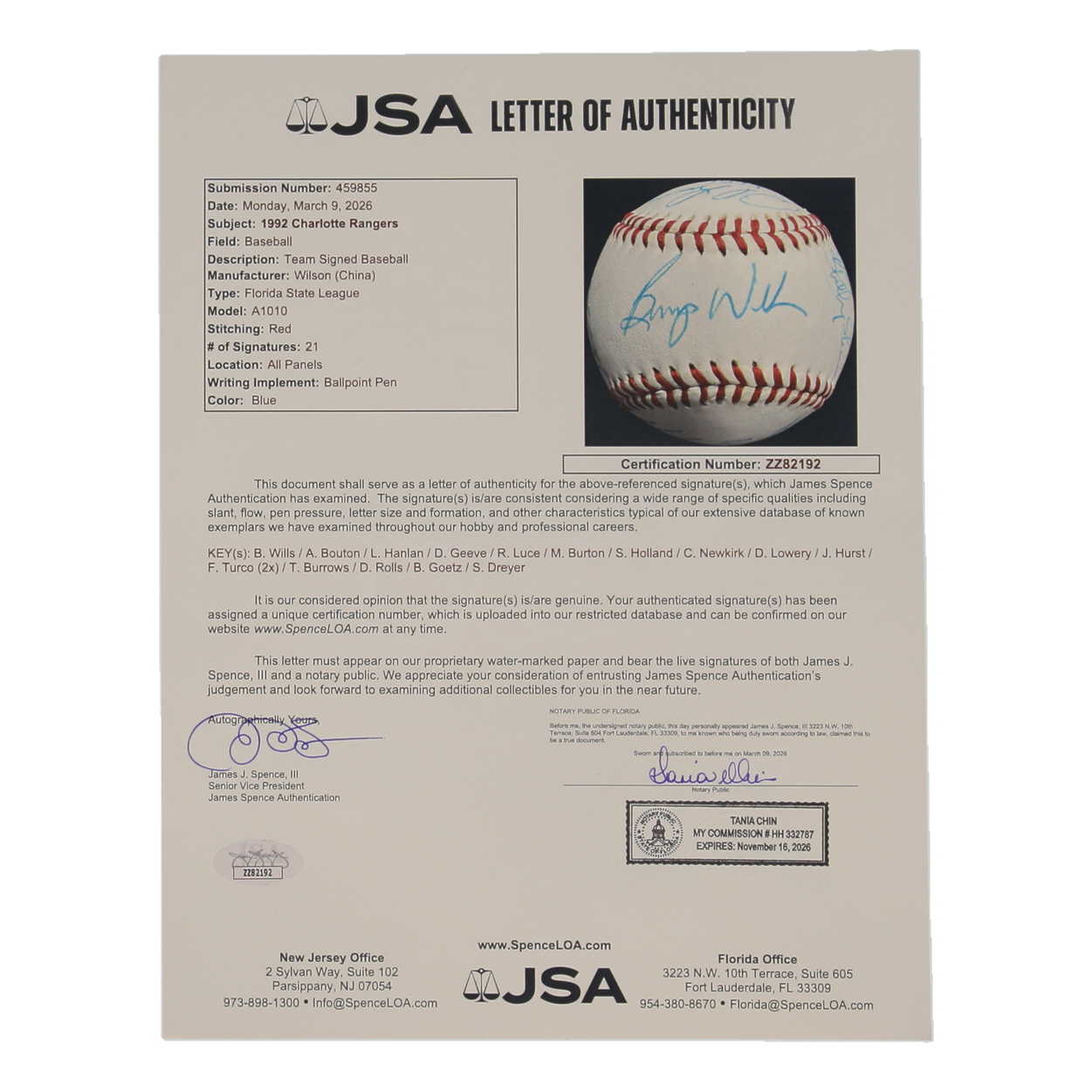 1992 Charlotte Rangers FSL Baseball Signed By (21) With Bump Wills, Frank Turco, Terry Burrows, Craig Newkirk (JSA)