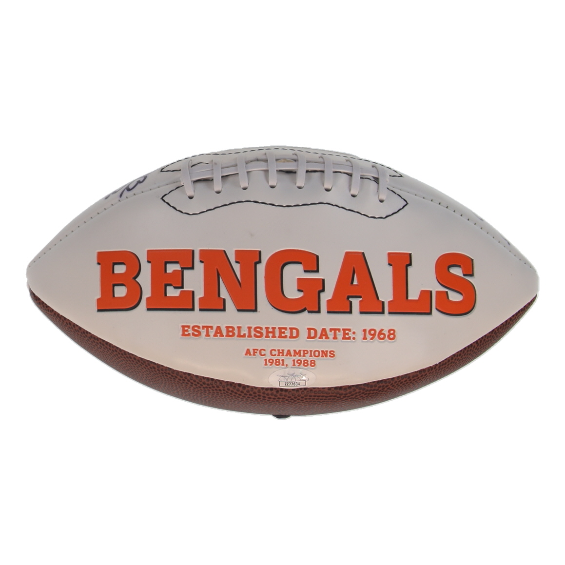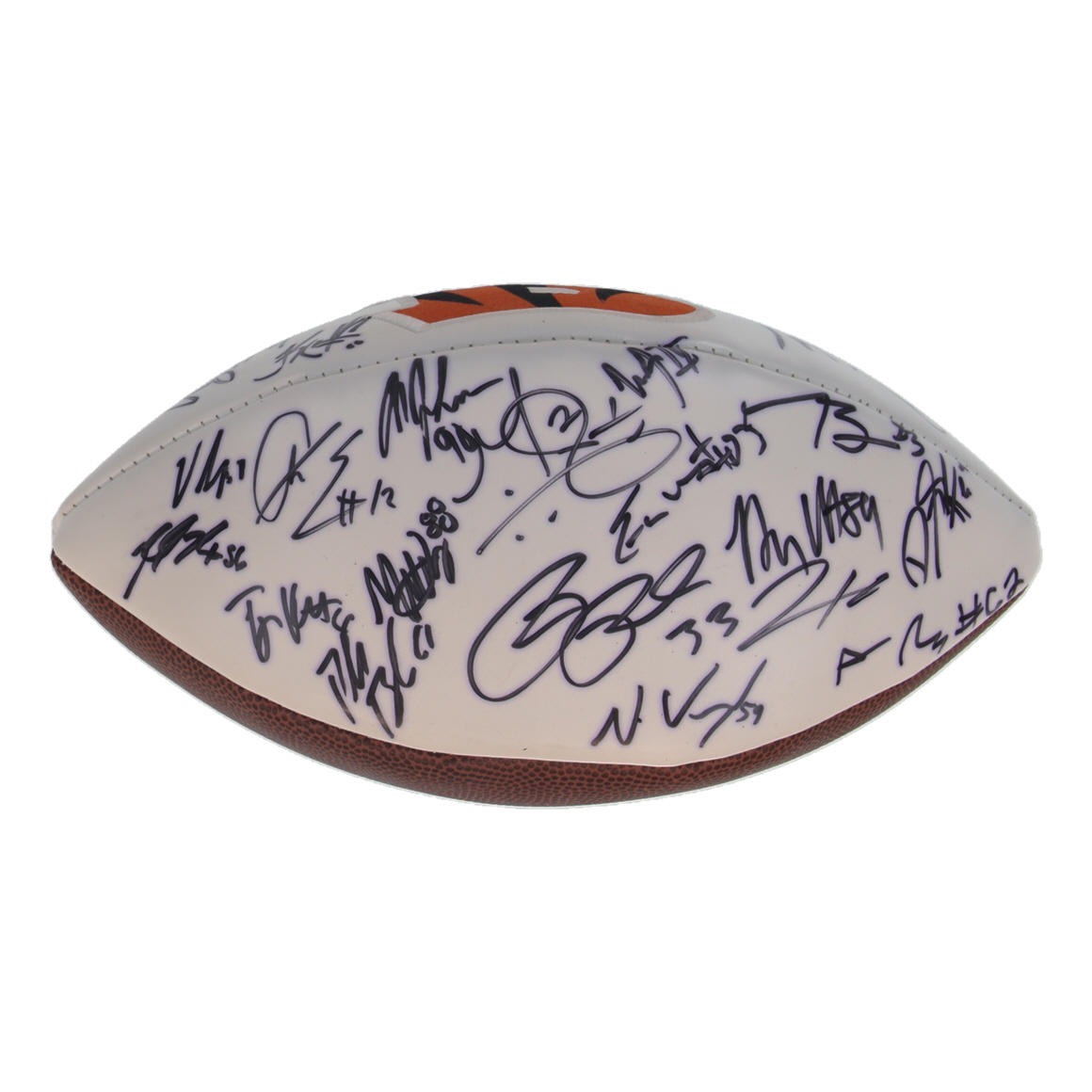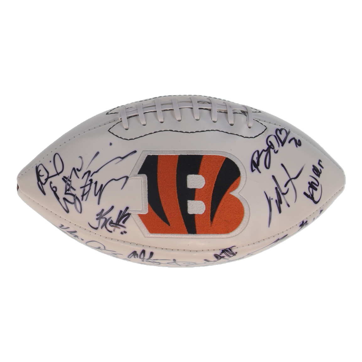 Cincinnati Bengals Football. Hand-signed by Jeff Driskel, Alex Erickson, Michael Johnson, Nick Vigil, Alex Redmond, Tyler Boyd, Cedric Ogbuehi, Mike Nugent and (15) others. Please note, there are stains throughout the football and the signatures have bled through.