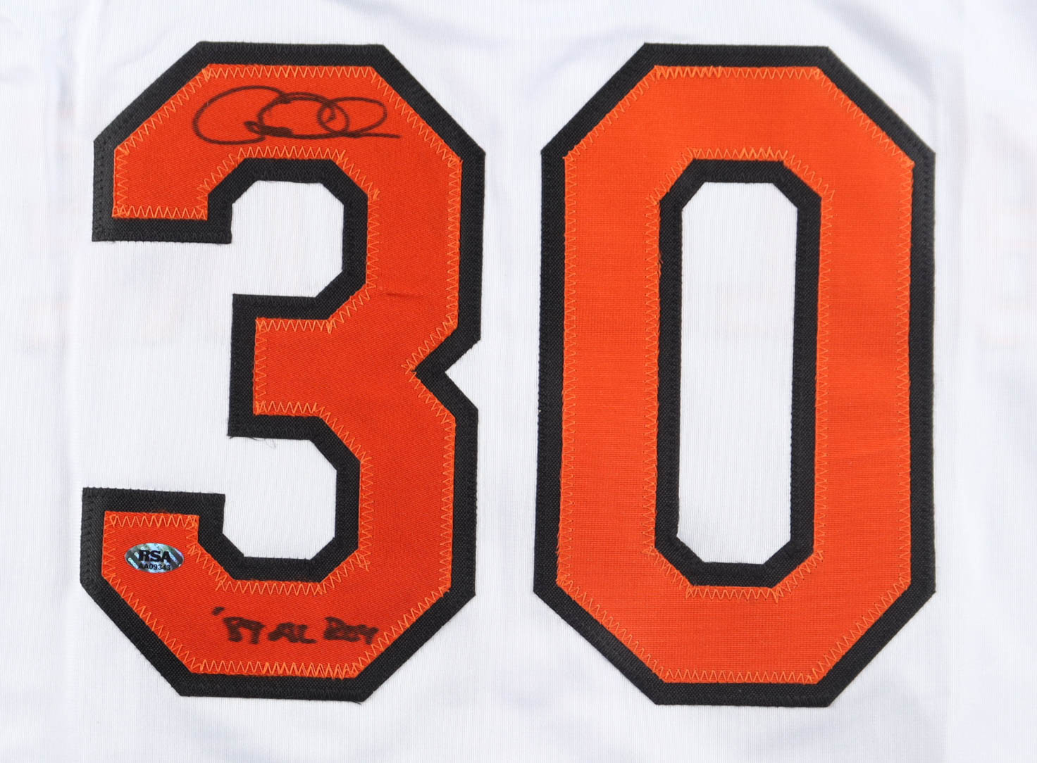 Custom jersey with everything sewn on, size XL. Hand-signed and inscribed by Gregg Olson.