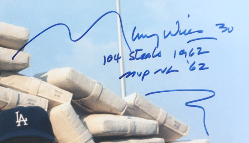 Custom frame measures approximately 22" x 26" in size and features an 16" x 20" photo that has been hand-signed and inscribed by Maury Wills (D. 2022, Los Angeles Dodgers).