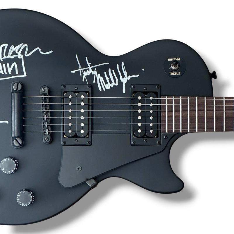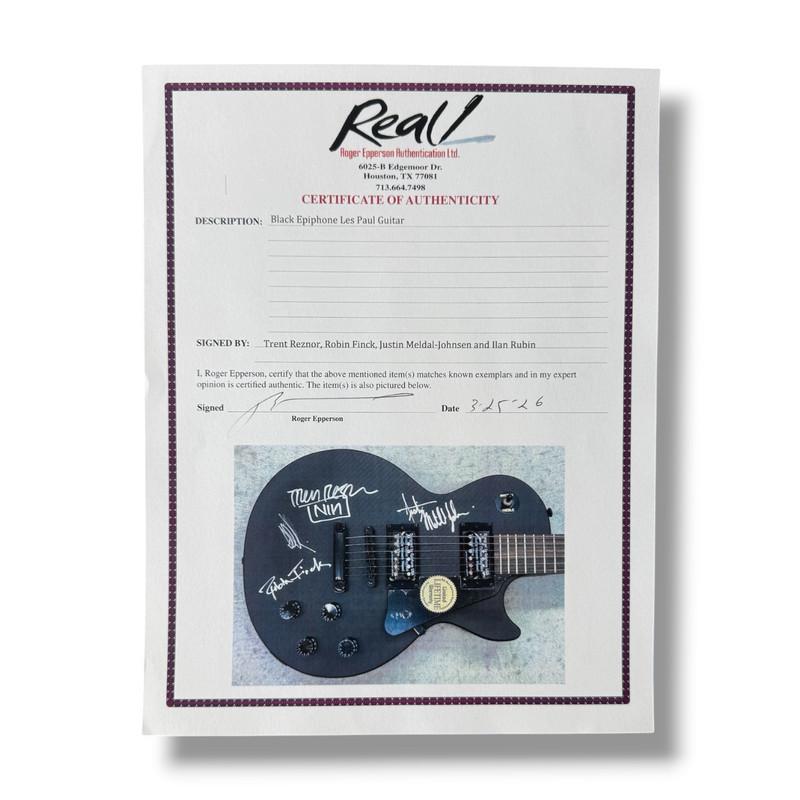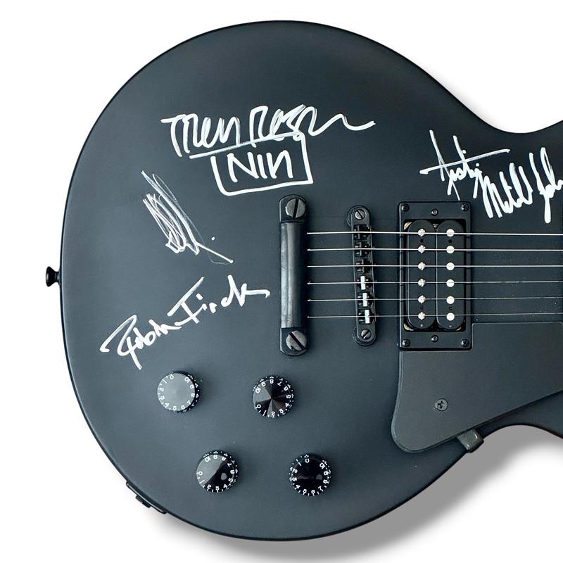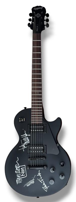 Epiphone Les Paul Studio electric guitar measures approximately 39" in length and has been hand-signed on the guitar body by Trent Reznor with "Nine Inch Nails" Logo hand drawn sketch (lead singer & guitarist), Robin Finck (multi-instrumentalist), Justin Mdeldal-Johnsen (bassist), and Ilan Rubin (drummer).