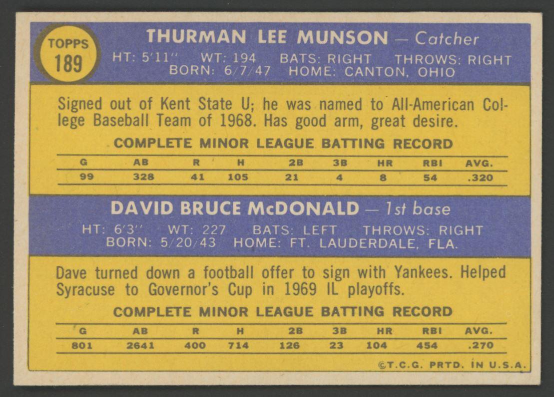 Thurman Munson RC / Dave McDonald RC 1970 Topps Rookie Stars #189