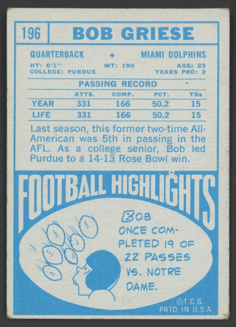 Bob Griese 1968 Topps #196 RC