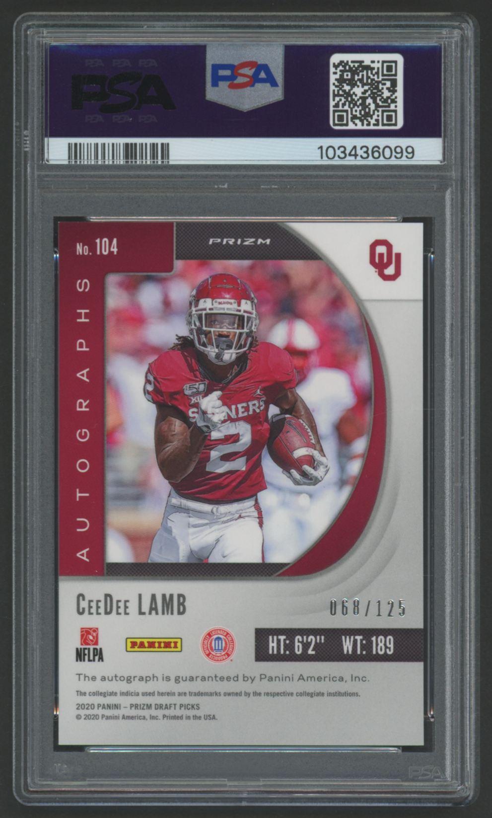 CeeDee Lamb 2020 Panini Prizm Draft Picks Autograph Purple / Green Prizm #104 RC #68/125 (PSA 9)