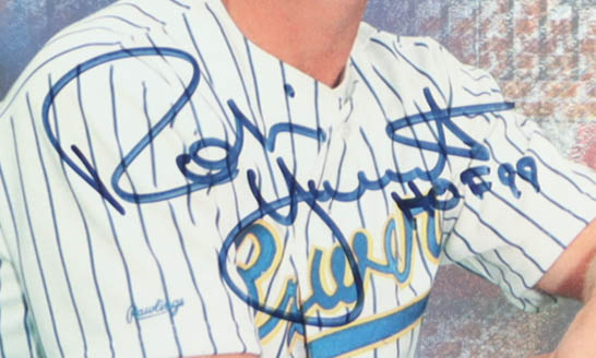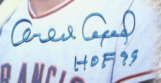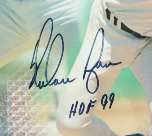 Custom frame measures approximately 27" x 38" in size and features an art print that has been hand-signed and inscribed by (4) Nolan Ryan, George Brett, Robin Yount, & Orlando Cepeda. Please refer to photos regarding the condition of the item.