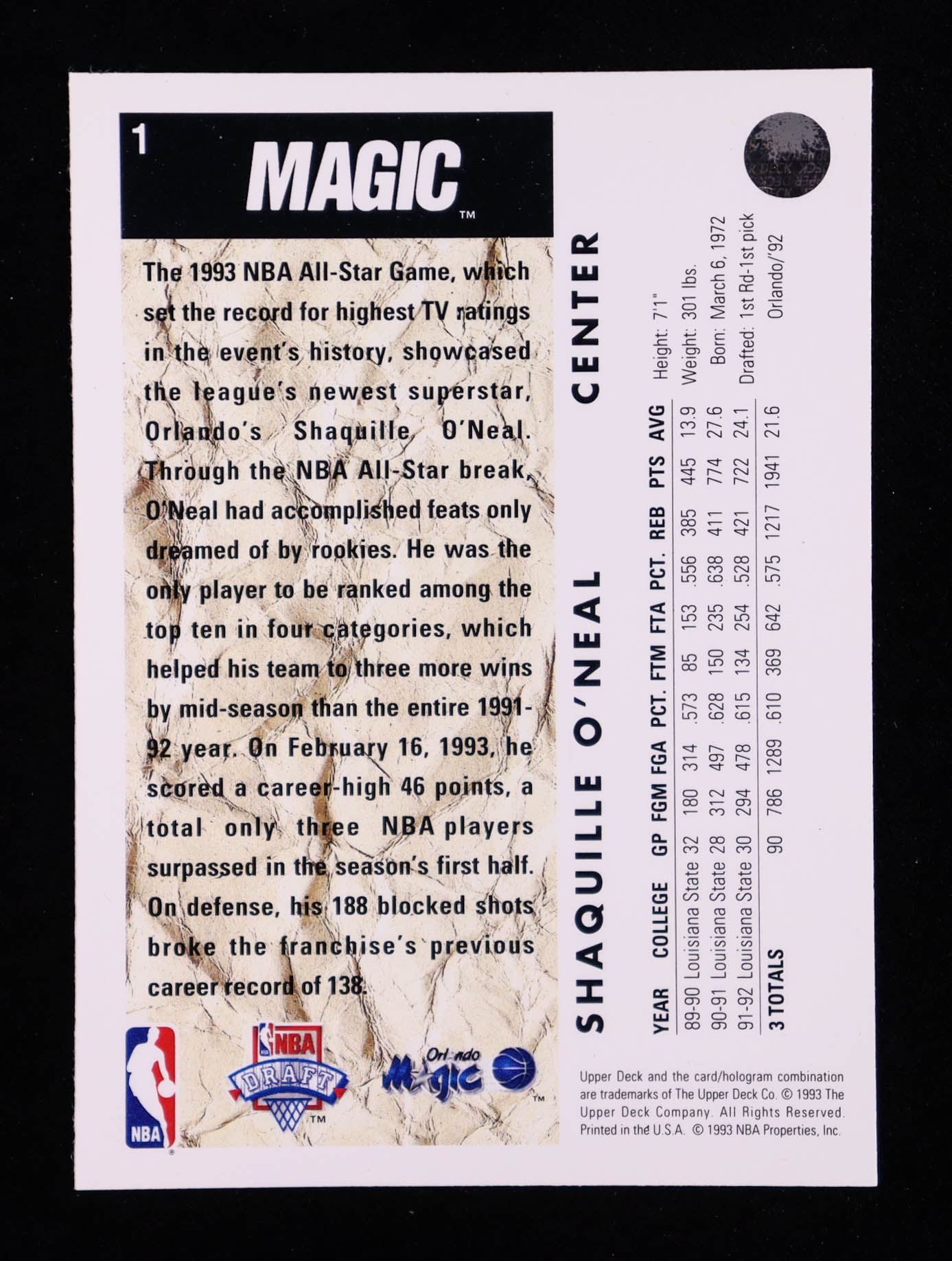 Shaquille O'Neal 1992-93 Upper Deck #1 Draft Pick
