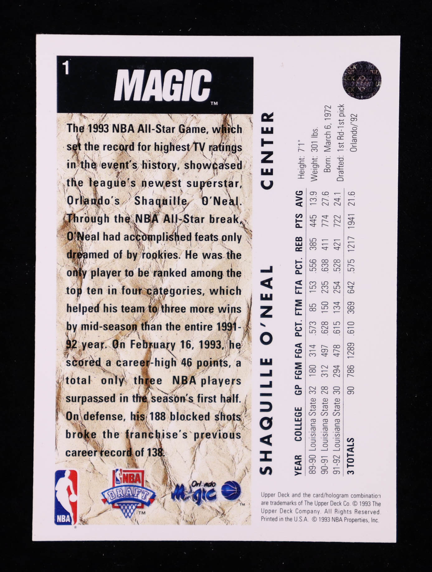 Shaquille O'Neal 1992-93 Upper Deck #1 Draft Pick