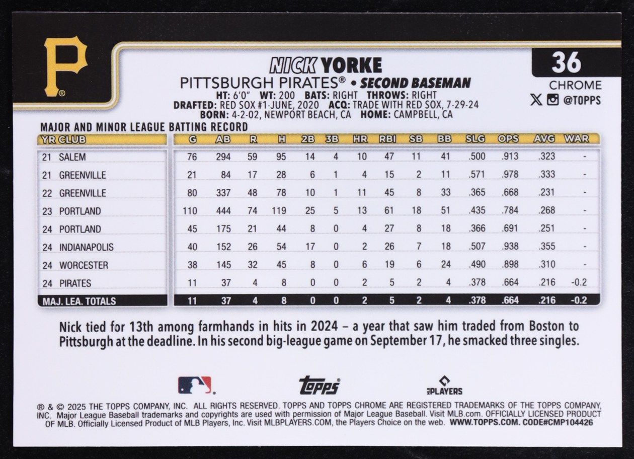 Nick Yorke 2025 Topps Chrome Purple Refractors #36 RC #199/250