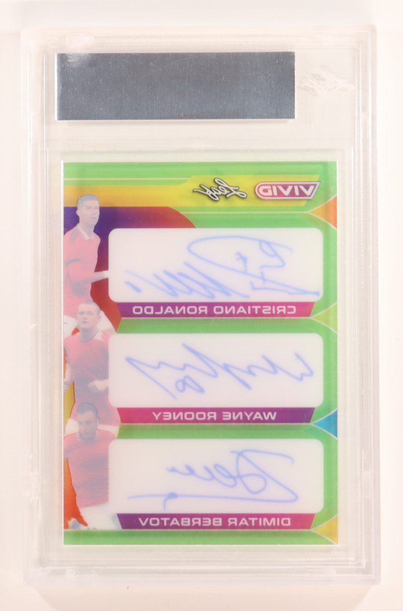 Cristiano Ronaldo / Wayne Rooney / Dimitar Berbatov 2022 Leaf Vivid Triple Autographs Prismatic Green Pre-Production Proof #NNO #1/1 (Leaf)