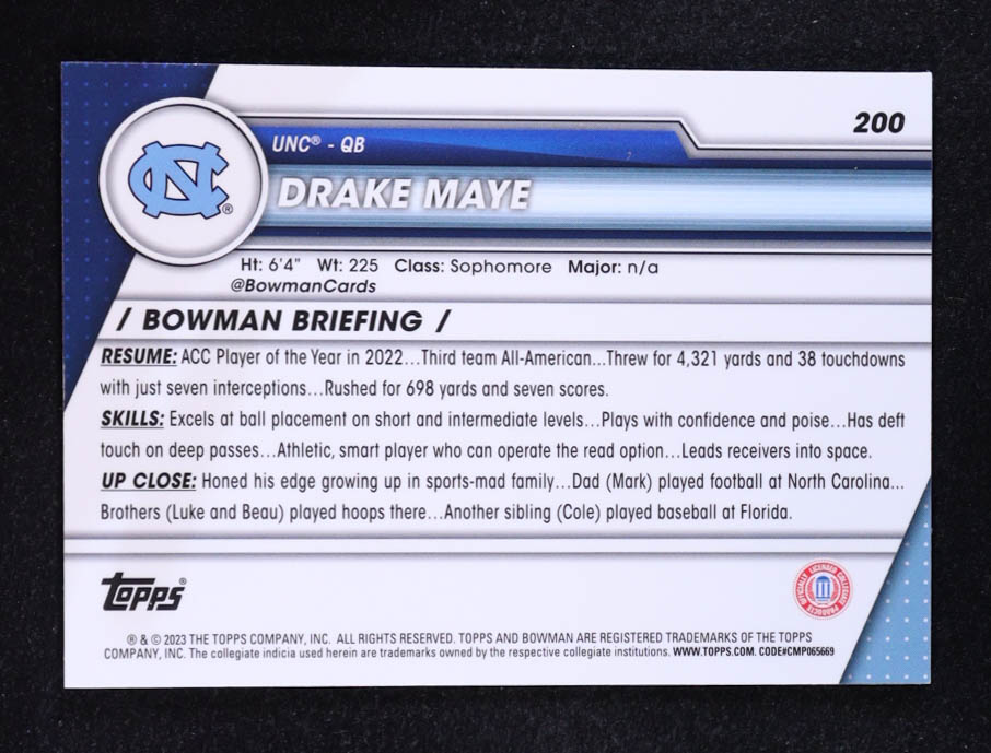 Drake Maye 2023 Bowman Chrome University #200 RC