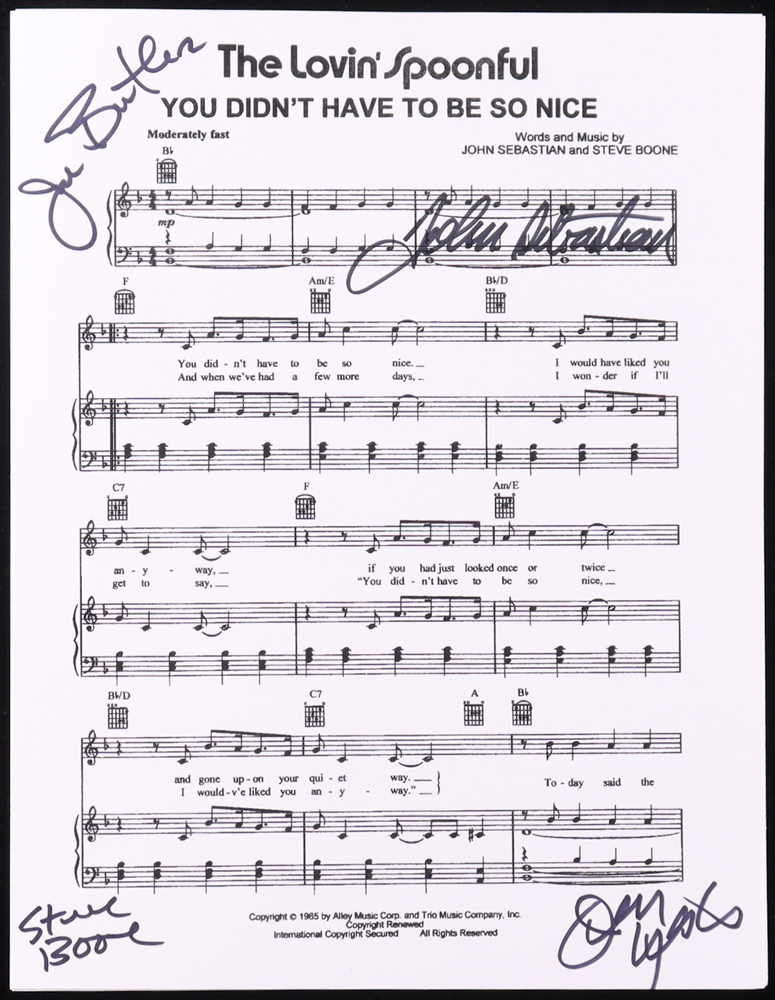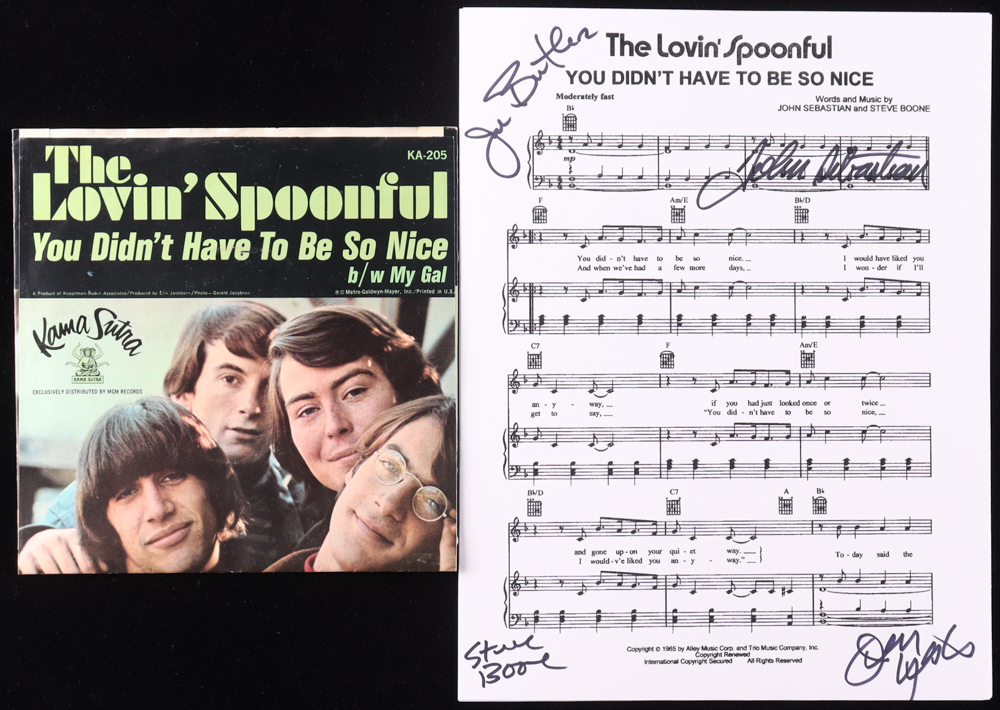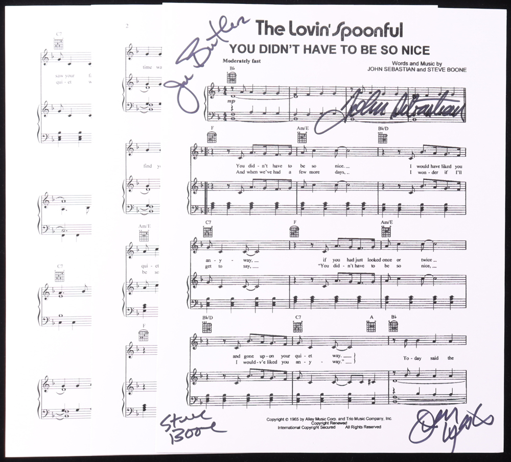 The Lovin' Spoonful | "You Didn't Have to Be So Nice" Sheet Music Signed by (4) with John Sebastian, Jerry Yester with 45RPM LP Vinyl Record (JSA)