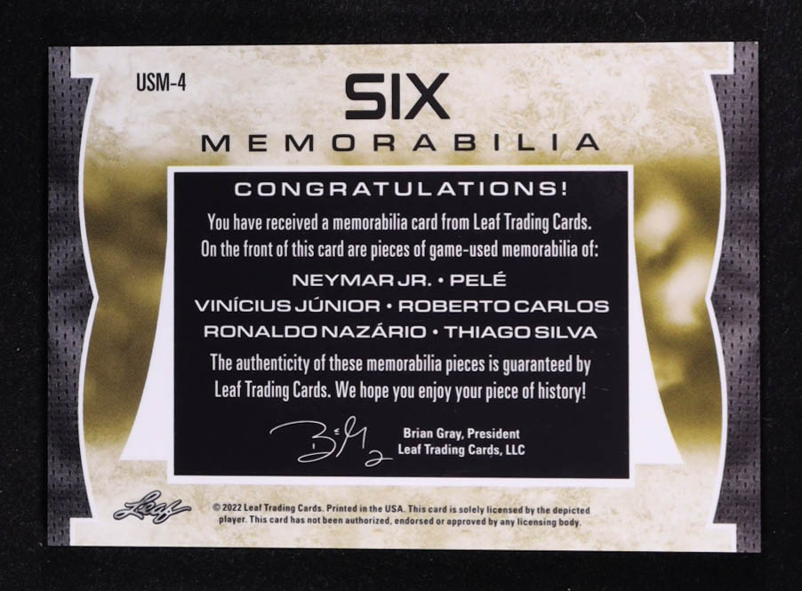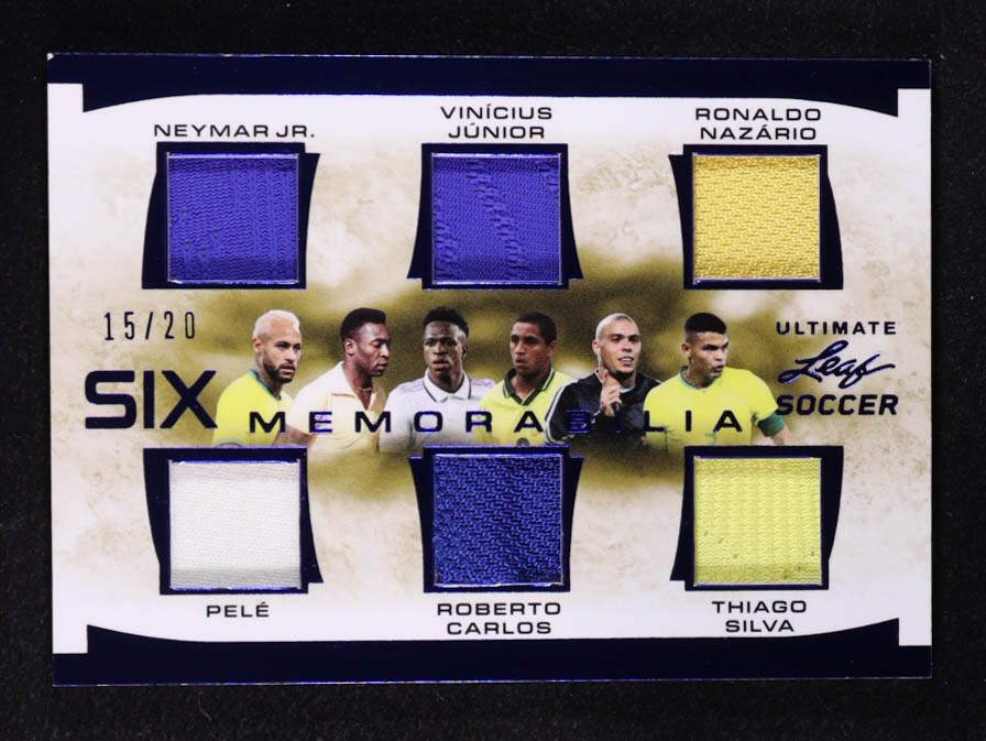 2022 Leaf Ultimate Soccer Six Memorabilia Platinum Spectrum #USM-4 #15/20 Neymar Jr. / Vinicius Junior / Ronaldo Nazario / Pele / Roberto Carlos / Thiago Silva