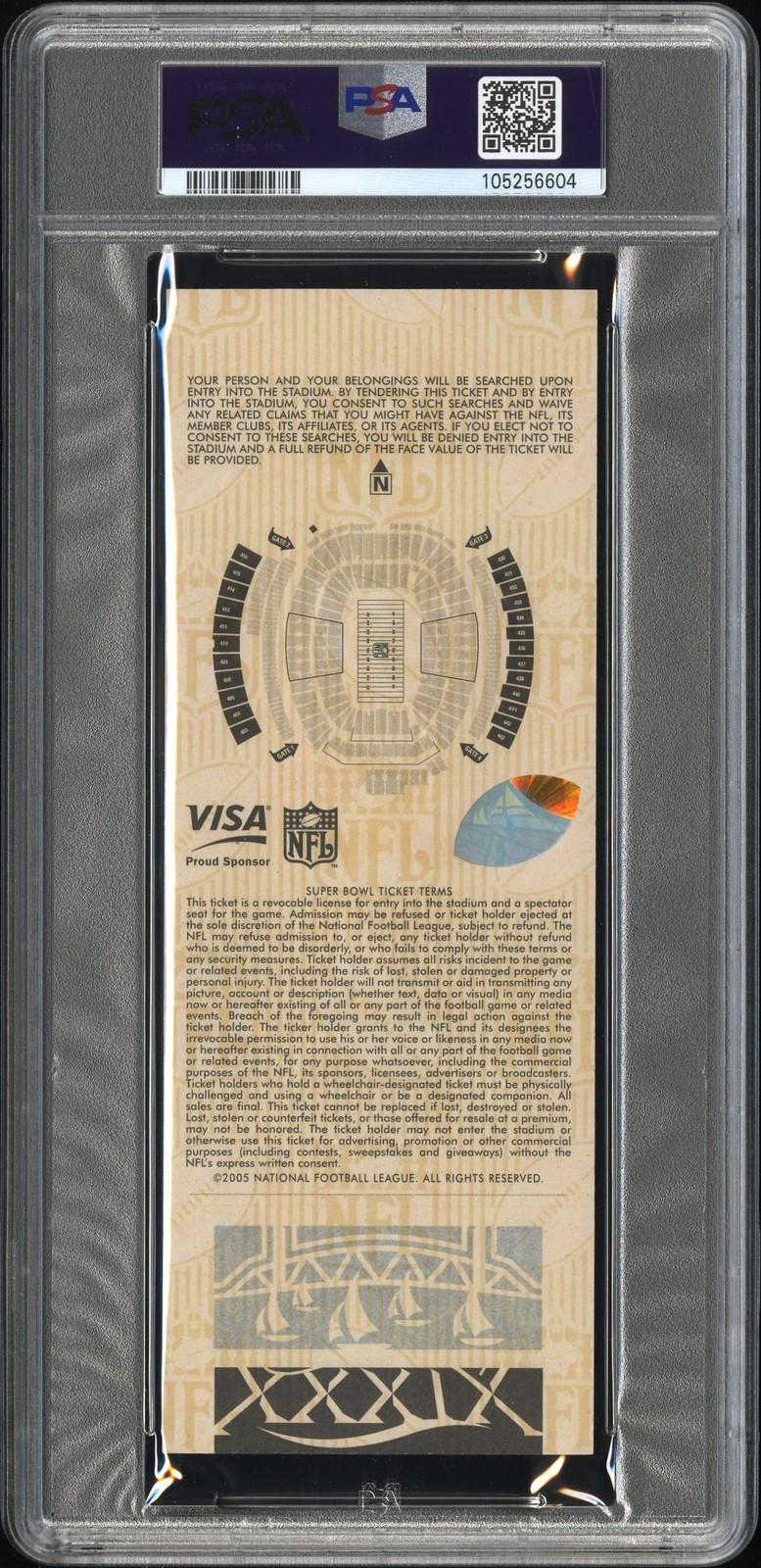 Super Bowl XXXIX ticket has been hand-signed by Tom Brady (New England Patriots) and graded PSA 9. This ticket is from Tom Brady's personal collection (TB12 Collection).