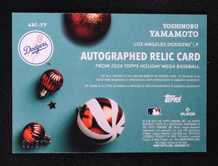 Yoshinobu Yamamoto 2024 Topps Holiday Autograph Relics Player-Worn #ARCYY #33/50