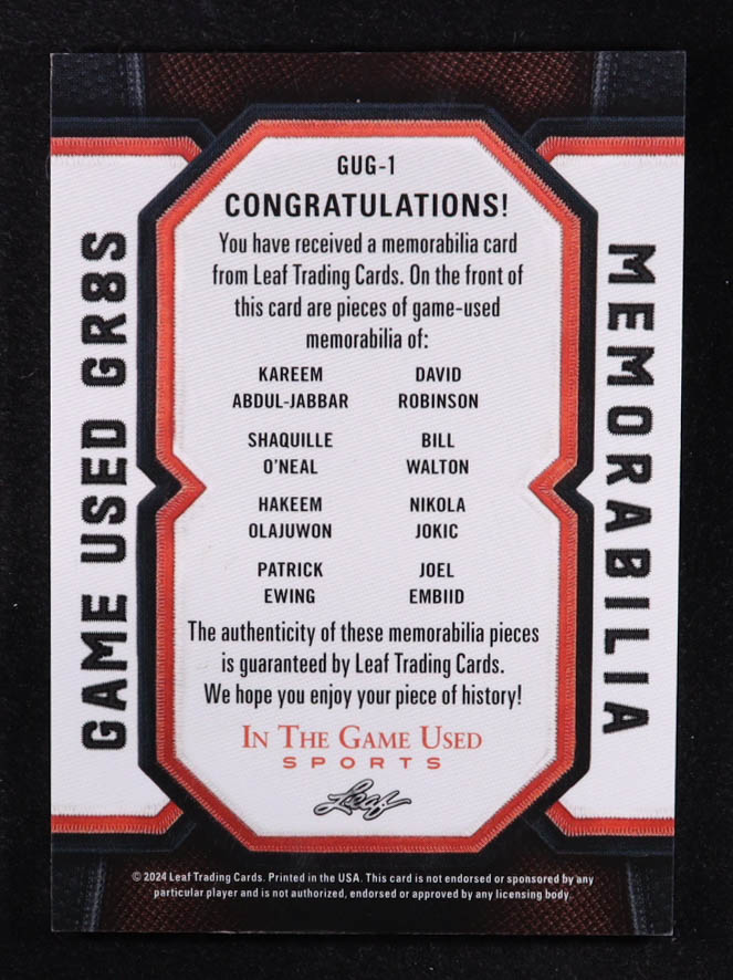 2024 Leaf in the Game Used Sports Game Used GR8S Bronze #GUG-1 #2/5 Kareem Abdul-Jabbar / Shaquille O'Neal / Hakeem Olajuwon / Patrick Ewing / David Robinson / Bill Walton / Nikola Jokic / Joel Embiid