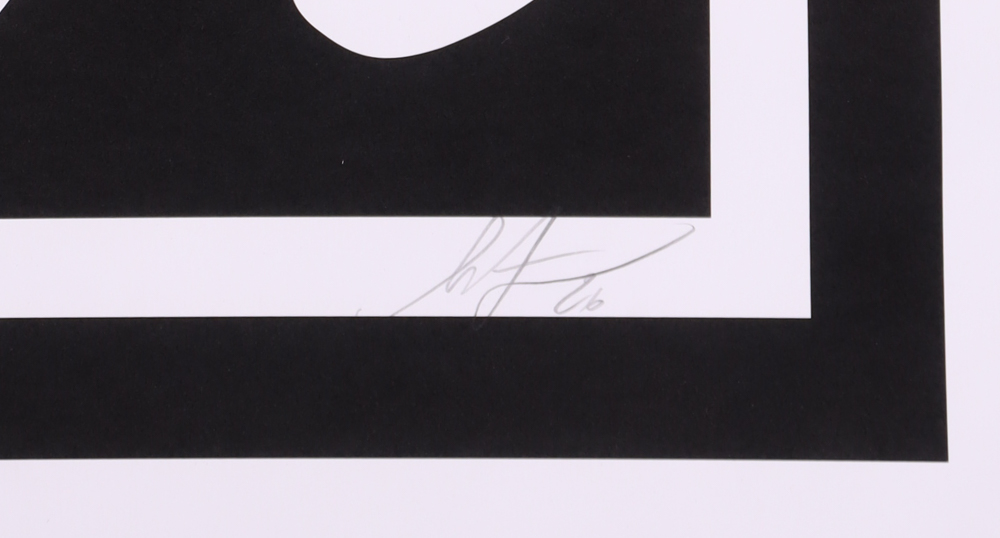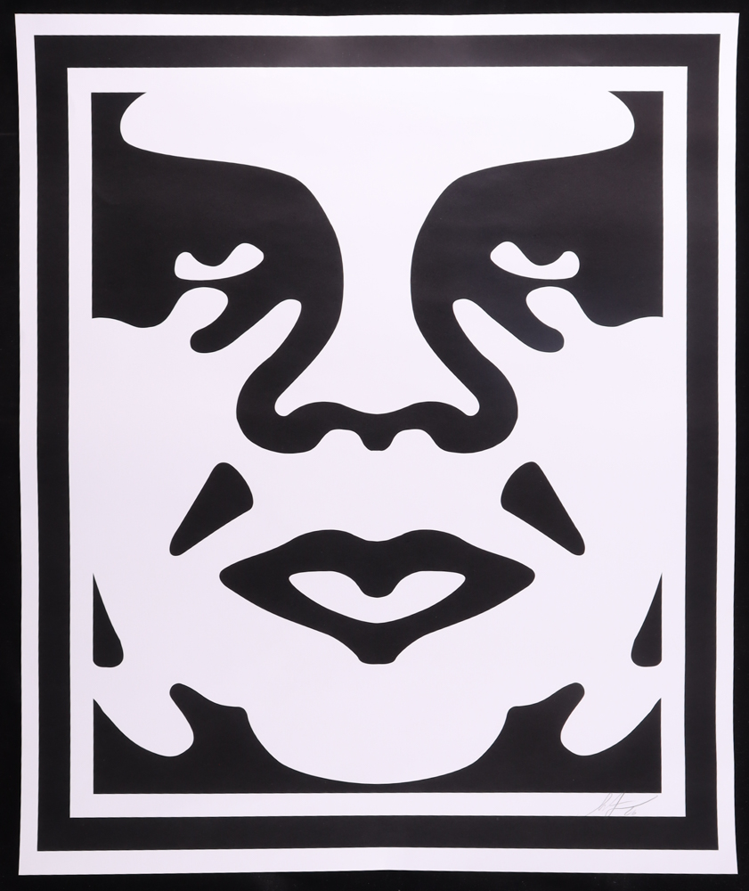 This piece measures approximately 25" x 30" in size and is hand-signed by renowned street artist, Shepard Fairey.