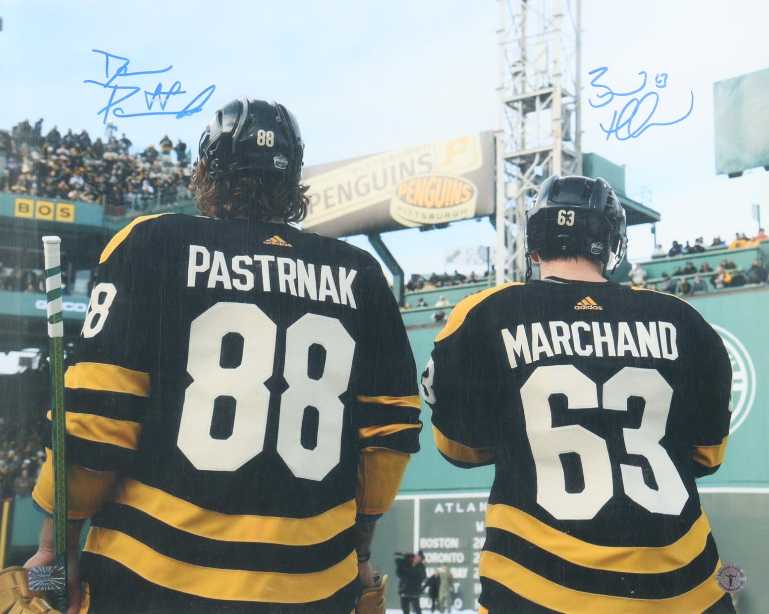 Photo measures 16" x 20" in size and has been hand-signed by Brad Marchand, and David Pastrnak (Boston Bruins).