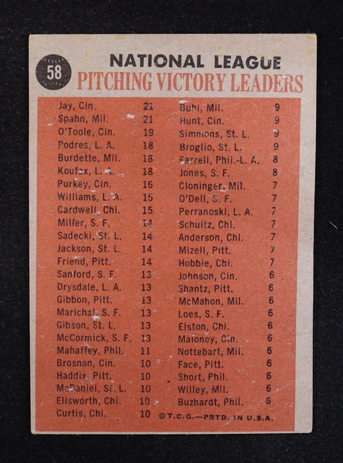 Warren Spahn / Joe Jay / Jim O'Toole 1962 Topps #58 NL Win Leaders