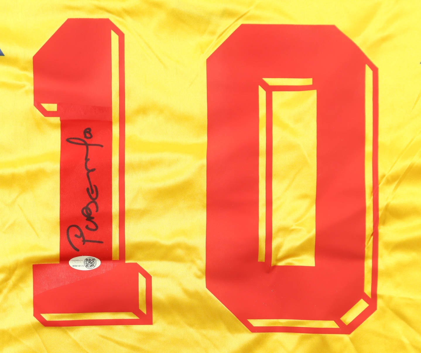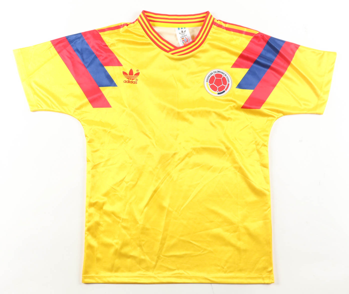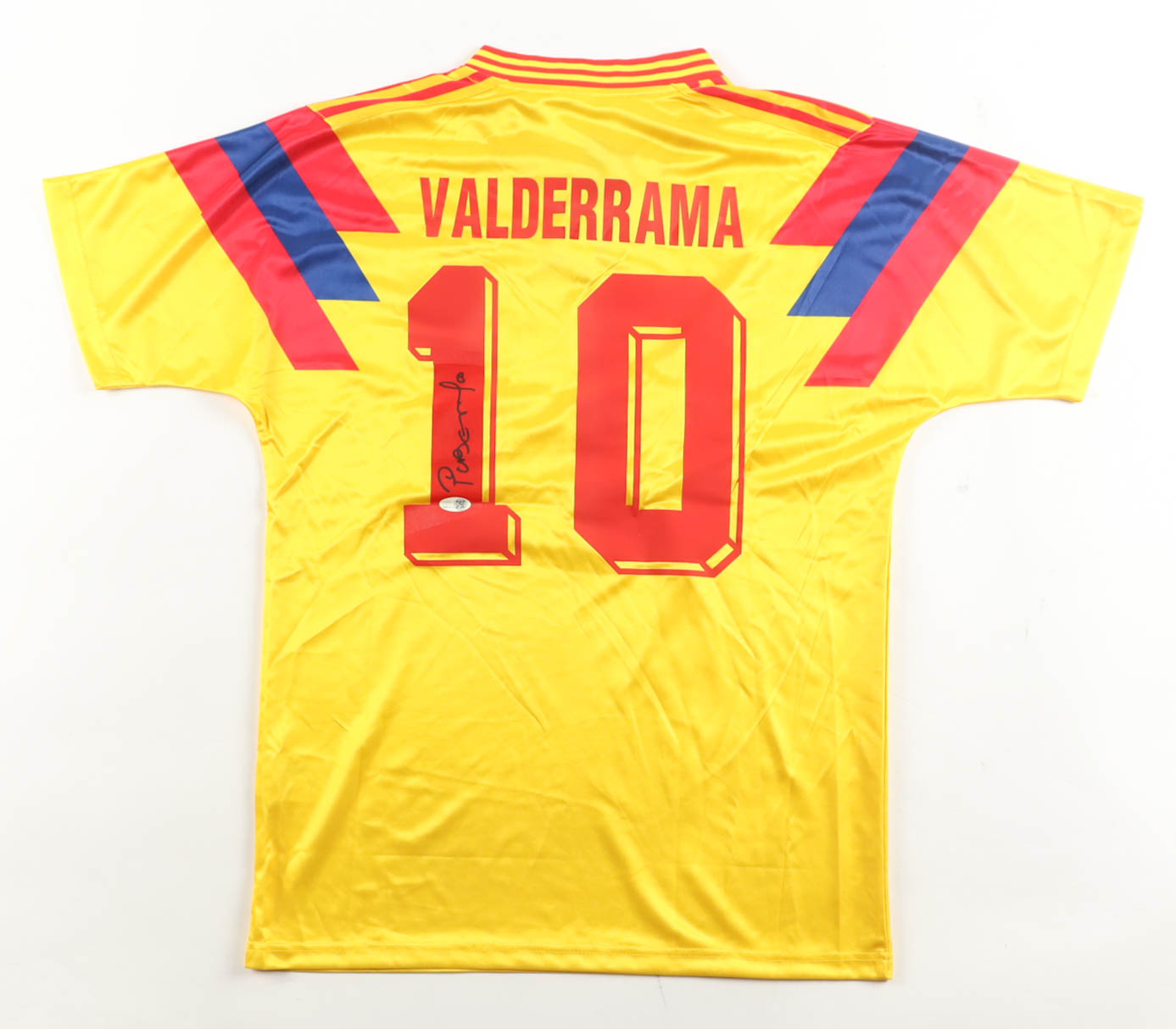 Adidas authentic jersey with everything pressed and sewn on, size M. Hand-signed by Carlos Valderrama (Columbian National Team).