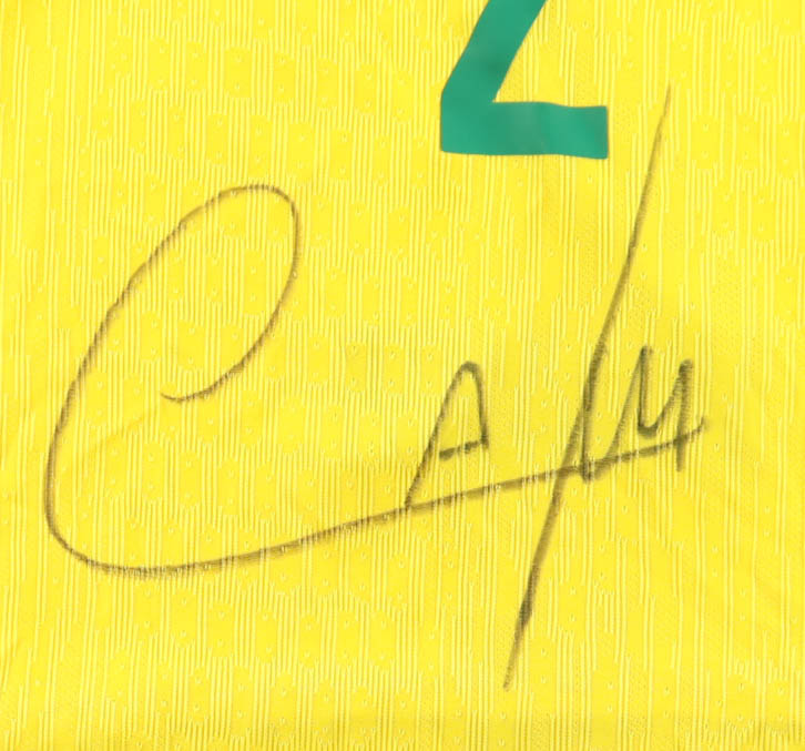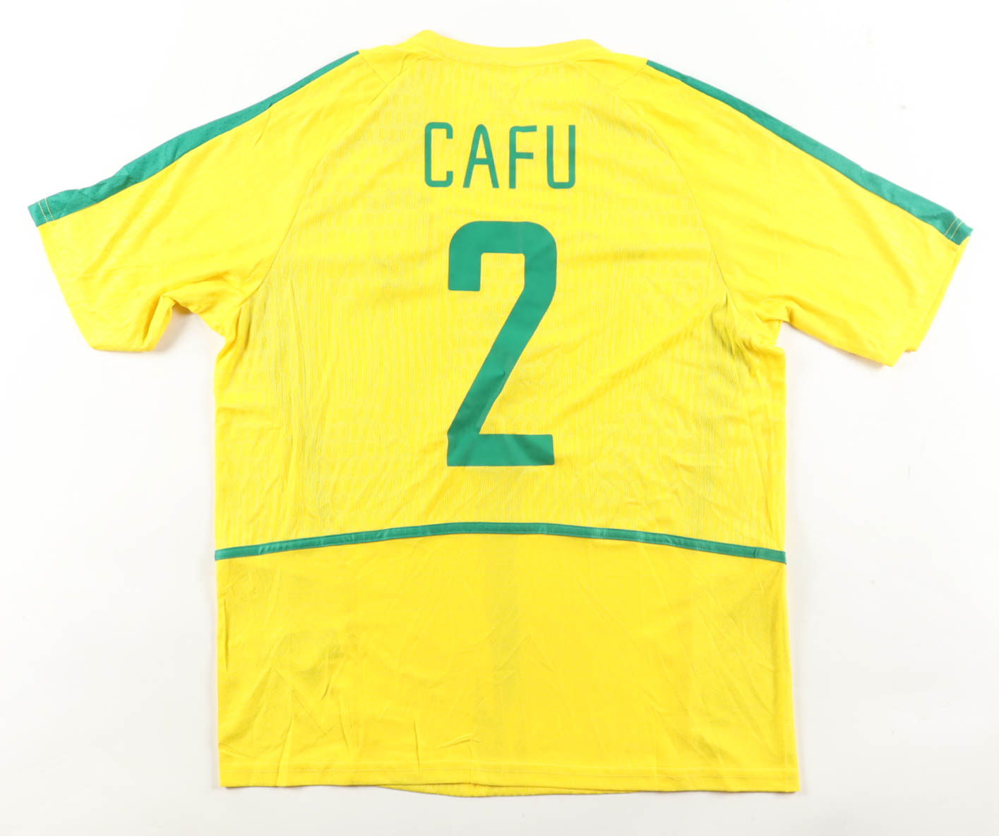 Nike authentic jersey with everything pressed on, size L. Hand-signed by Cafu (Brazil National Team).