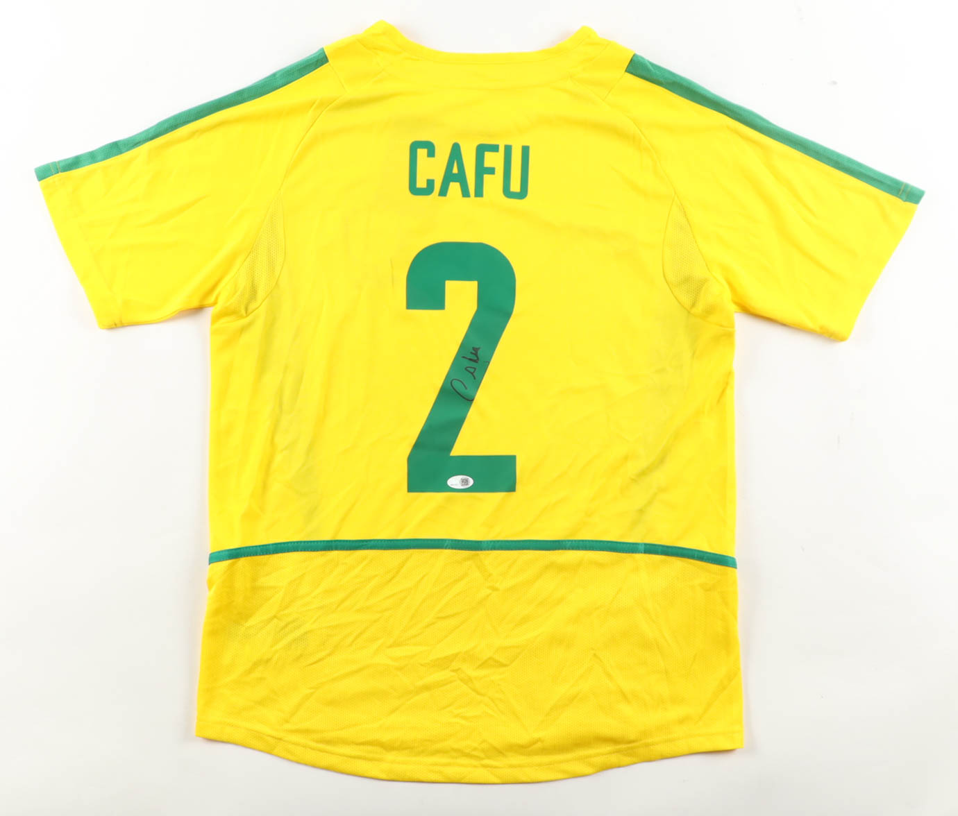 Nike authentic jersey with everything pressed on, size L. Hand-signed by Cafu (Brazil National Team).