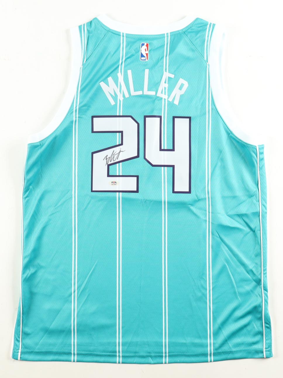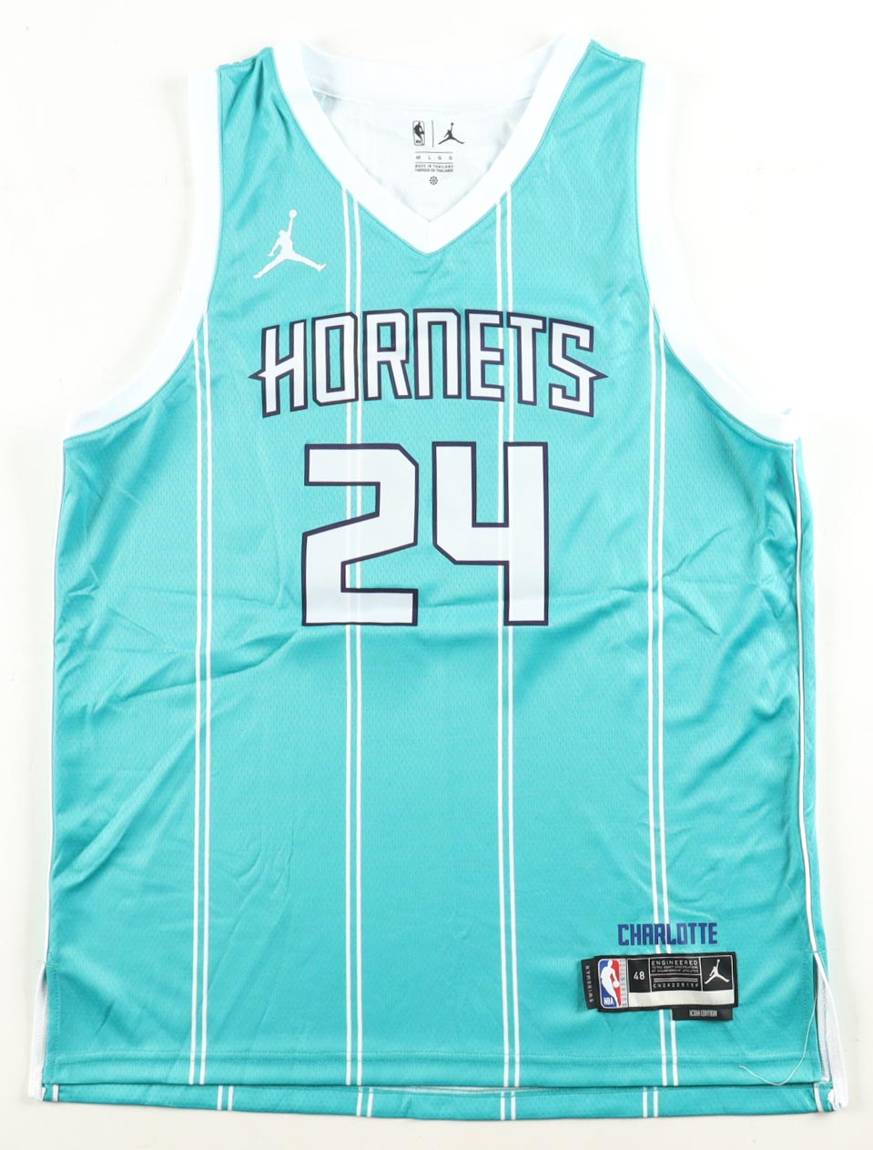 Jordan authentic jersey with everything pressed on, size 48. Hand-signed by Brandon Miller (Charlotte Hornets).