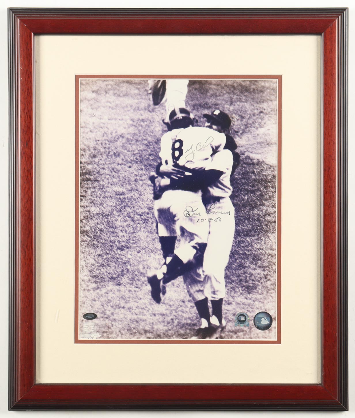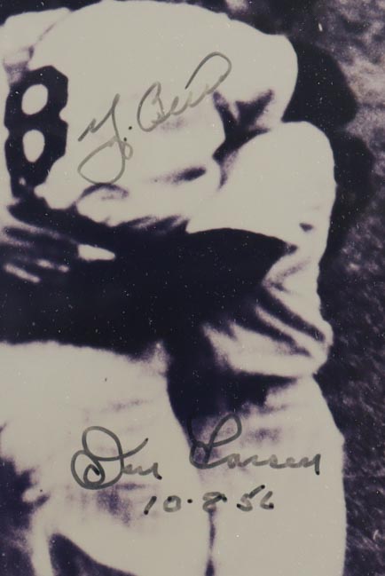 Custom frame display measures approximately 18" x 21" in size and features an 11" x 14" photo that has been hand-signed and inscribed by Yogi Berra (D. 2015, New York Yankees, HOF) and Don Larsen (D. 2020, New York Yankees, HOF). Please see photos for details regarding the item.