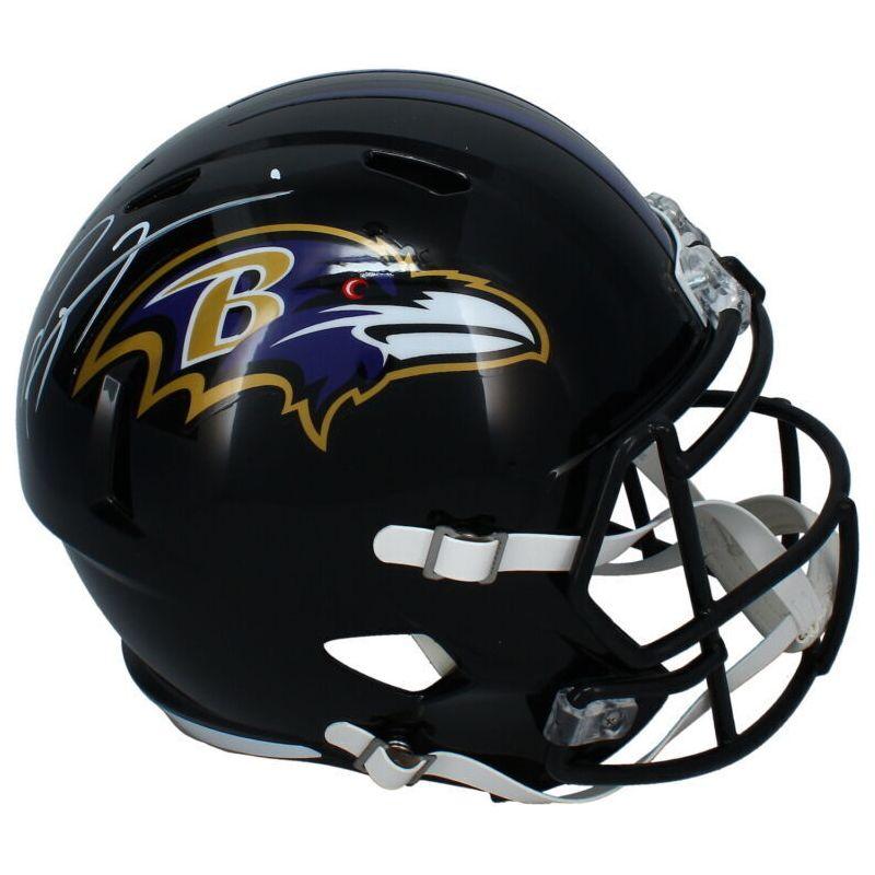 Riddell Baltimore Ravens full-size speed replica helmet. Hand-signed by Ray Lewis (HOF).