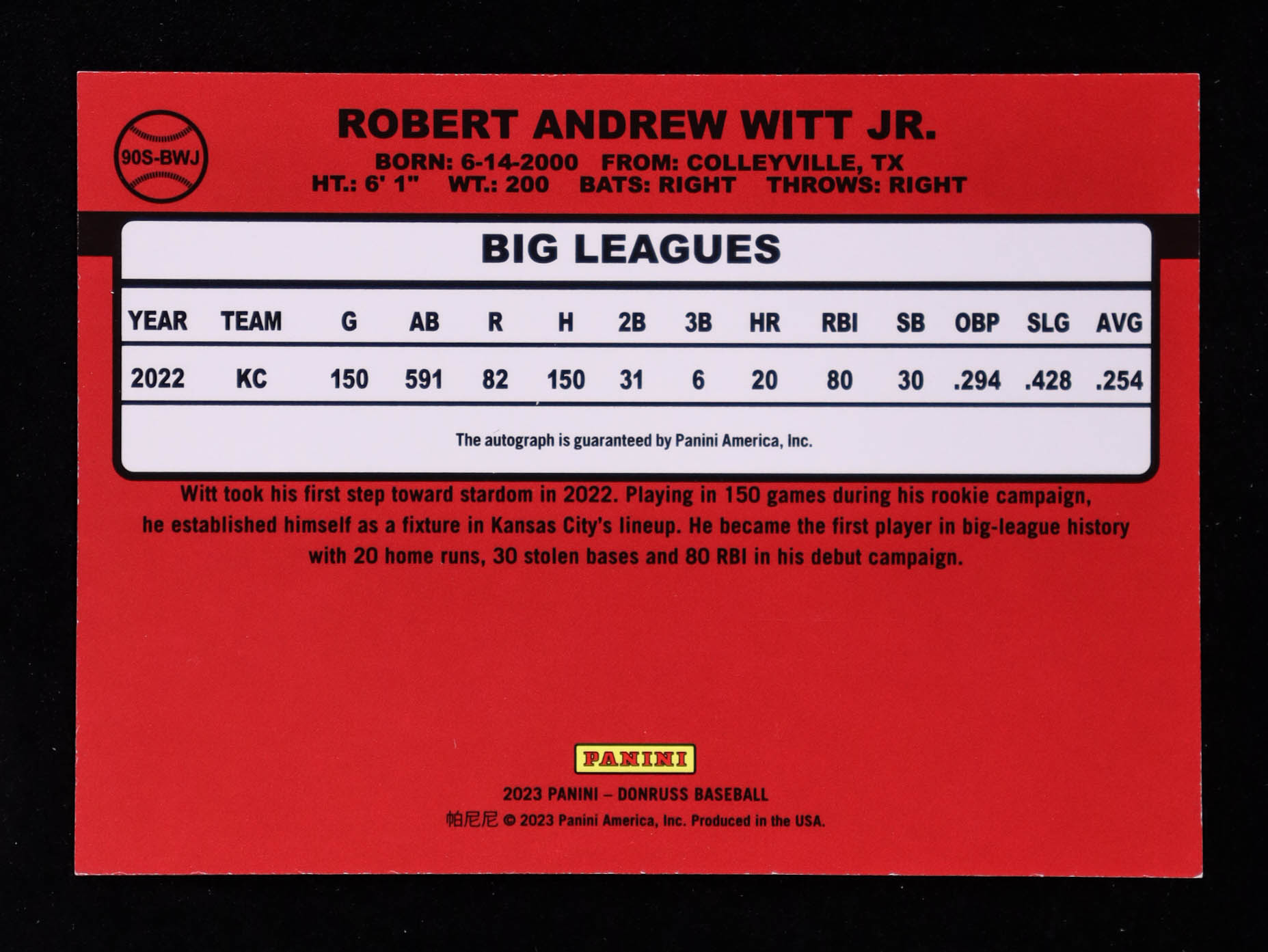 Bobby Witt Jr. 2023 Donruss Retro '90 Signatures Red #100 #83/99