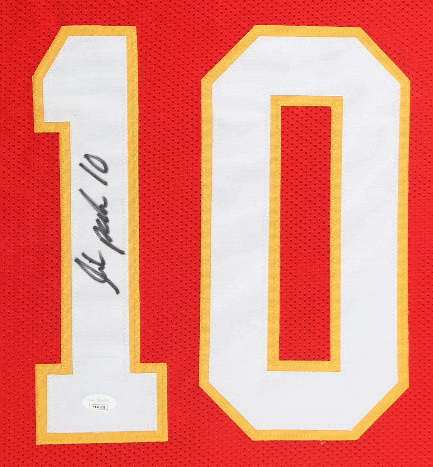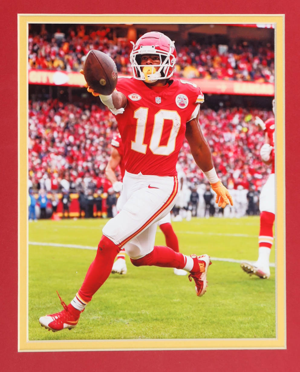 Custom frame measures 35" x 42" in size and features a jersey that has been hand-signed by Isiah Pacheco (Kansas City Chiefs). Please refer to photos regarding the condition of the item.