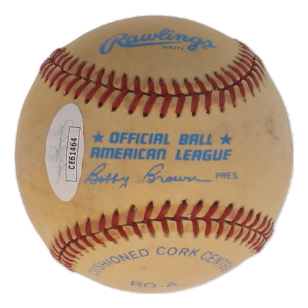 Rawlings Official American League Baseball. Hand-signed by Reggie Jackson (New York Yankees, HOF). Please note, the baseball is naturally toned as well as slightly stained.