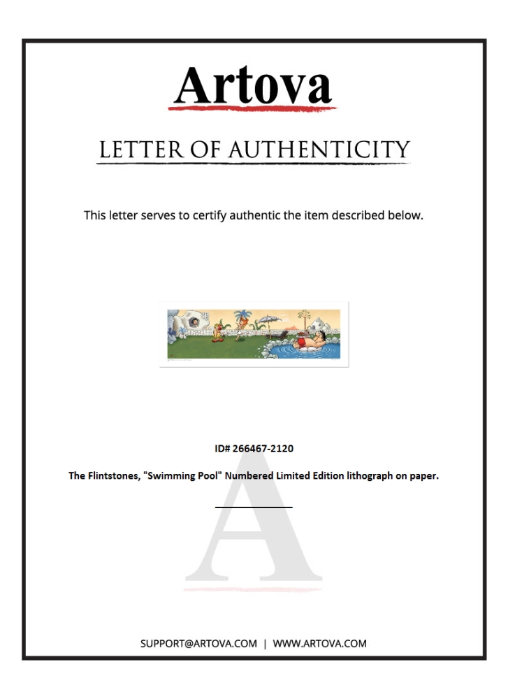 "Swimming Pool" is a licensed limited edition lithograph on paper featuring classic Hanna-Barbera characters from The Flintstones. The peice comes numbered, with hologram seal, and a Certificate of Authenticity! Measures approximately 16" x 36" (with border), 10" x 35" (image).