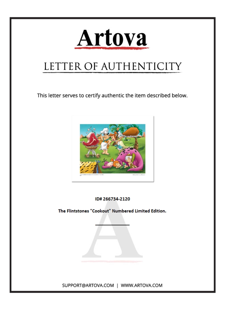 "Cookout" is a licensed limited edition giclee on paper featuring classic Hanna-Barbera characters from The Flintstones. It comes numbered, with hologram seal, and a Certificate of Authenticity! Measures approx. 16" x 20" (with border), 12" x 16" (image).