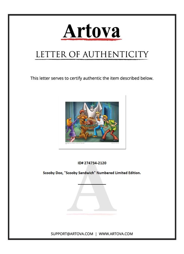 "Scooby Sandwich" is a limited edition giclee on paper from Hanna-Barbera featuring iconic Scooby Doo characters. It comes numbered, with hologram seal, and a Certificate of Authenticity! Measures approx. 16" x 20" (with border), 12" x 16" (image).