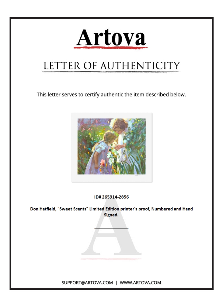 "Sweet Scents" is a limited edition printer's proof serigraph on paper by Don Hatfield, numbered and hand signed by the artist. Includes Letter of Authenticity. Measures approx. 29.5" x 34" (border), 24" x 29" (image).