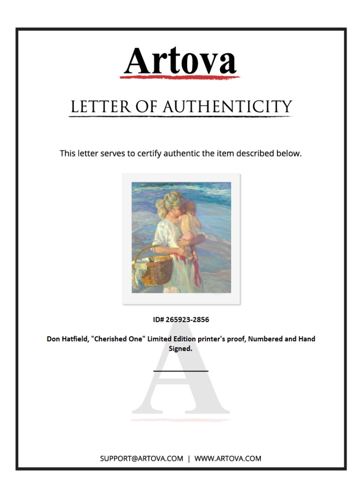 "Cherished One" is a limited edition printer's proof serigraph on paper by Don Hatfield, numbered and hand signed by the artist. Includes Letter of Authenticity. Measures approx. 35.5" x 32" (border), 30" x 27" (image).