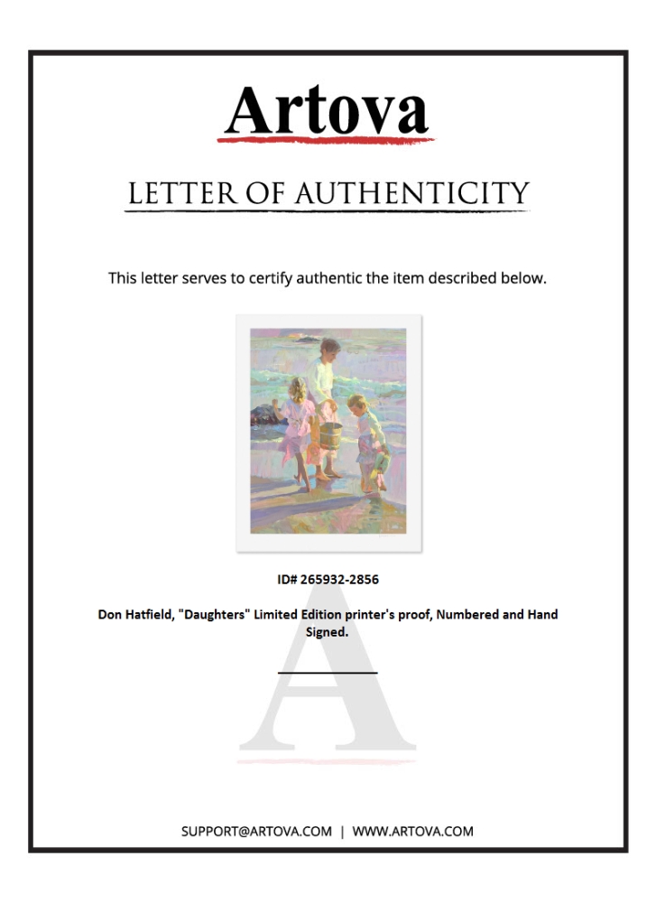 "Daughters" is a limited edition printer's proof serigraph on paper by Don Hatfield, numbered and hand signed by the artist. Includes Letter of Authenticity. Measures approx. 39.5" x 31" (border), 34" x 26" (image).