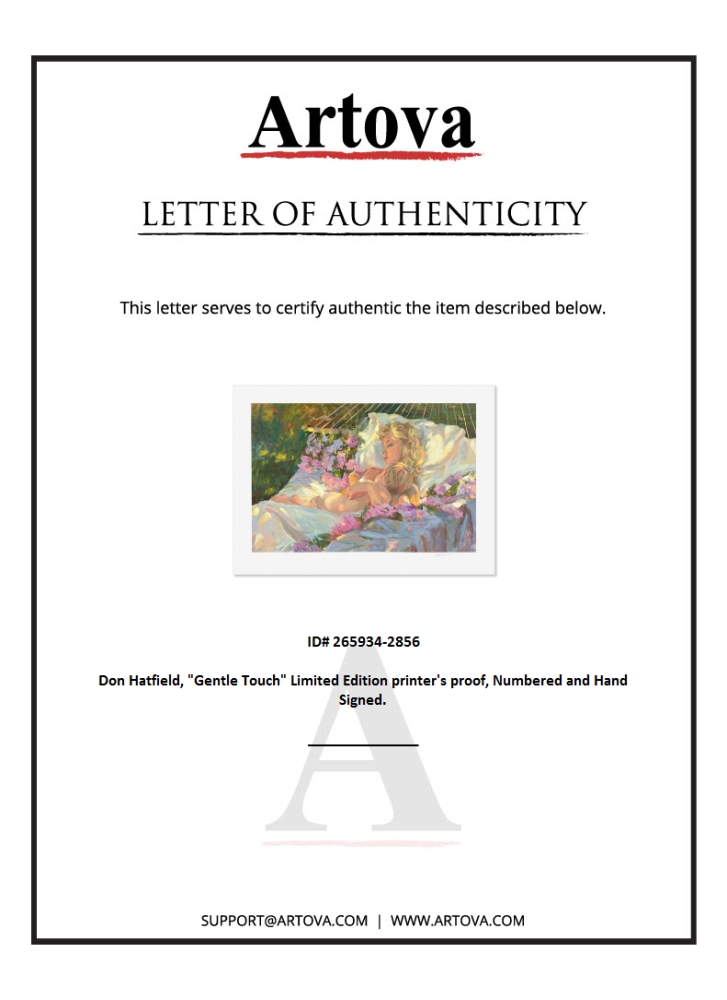 "Gentle Touch" is a limited edition printer's proof serigraph on paper by Don Hatfield, numbered and hand signed by the artist. Includes Letter of Authenticity. Measures approx. 25.5" x 35.5" (border), 20" x 30" (image).