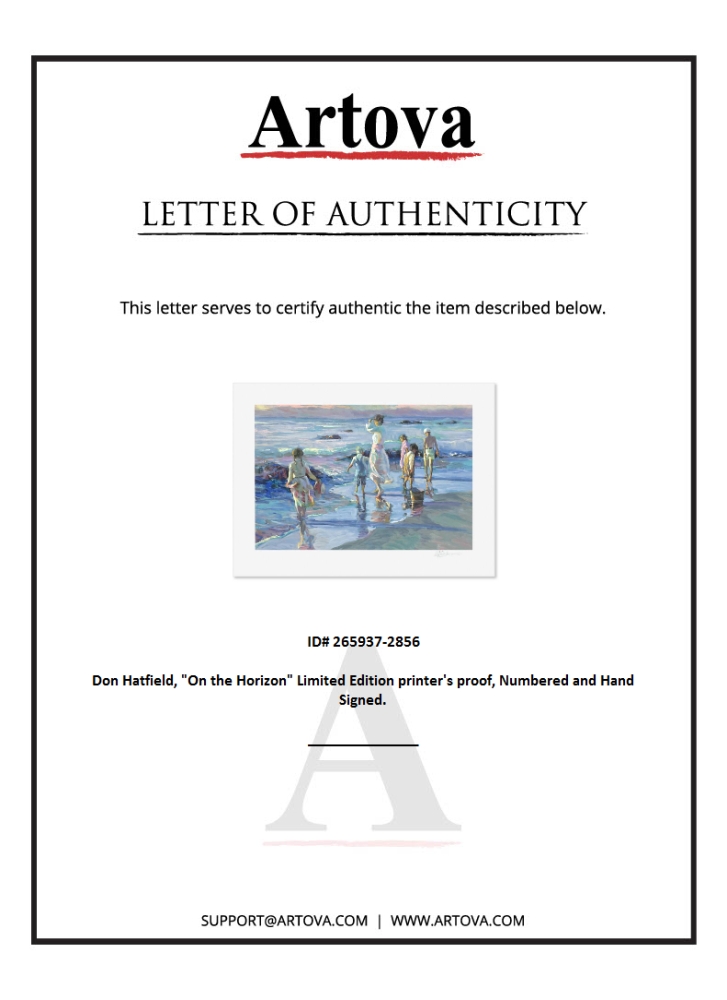 "On the Horizon" is a limited edition printer's proof serigraph on paper by Don Hatfield, numbered and hand signed by the artist. Includes Letter of Authenticity. Measures approx. 21.5" x 29" (border), 16" x 24" (image).