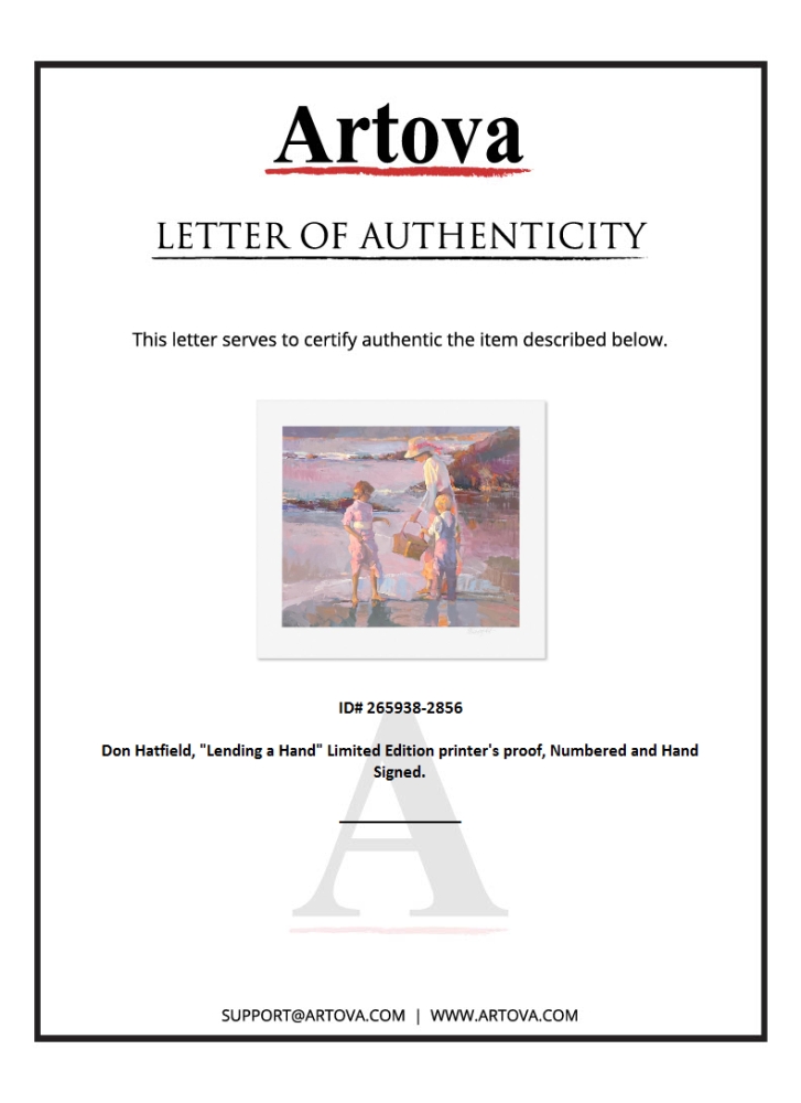 "Lending a Hand" is a limited edition printer's proof serigraph on paper by Don Hatfield, numbered and hand signed by the artist. Includes Letter of Authenticity. Measures approx. 25.5" x 29" (border), 20" x 24" (image).