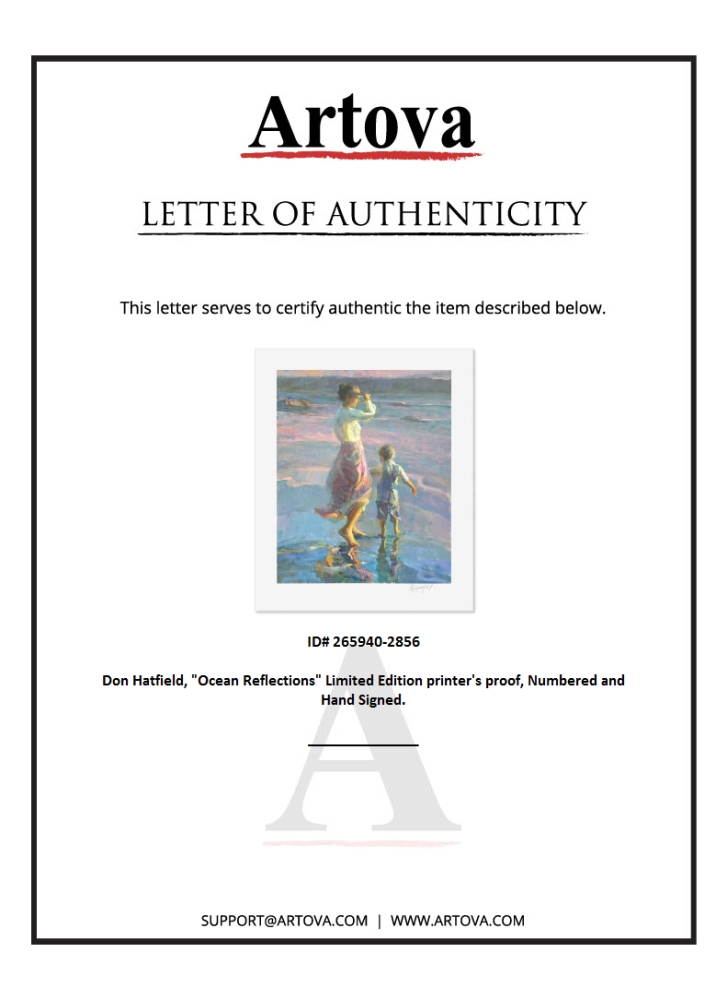 "Ocean Reflections" is a limited edition printer's proof serigraph on paper by Don Hatfield, numbered and hand signed by the artist. Includes Letter of Authenticity. Measures approx. 29.5" x 25" (border), 24" x 20" (image).
