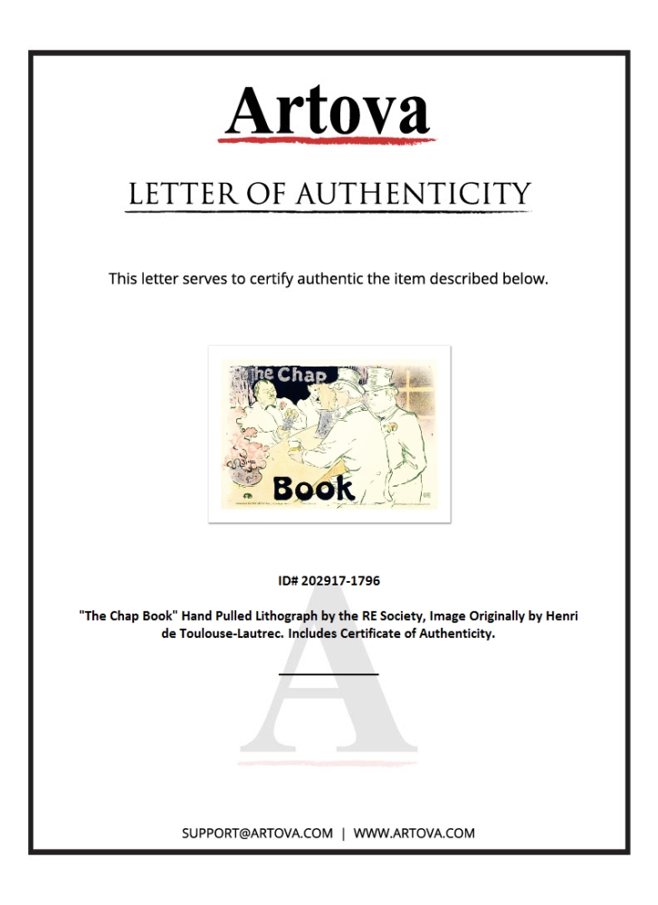 "The Chap Book" is a hand-pulled lithograph on paper by the RE Society, an image originally by Henri de Toulouse-Lautrec. Measures approximately 19" x 26" (with border), 23" x 16" (image).