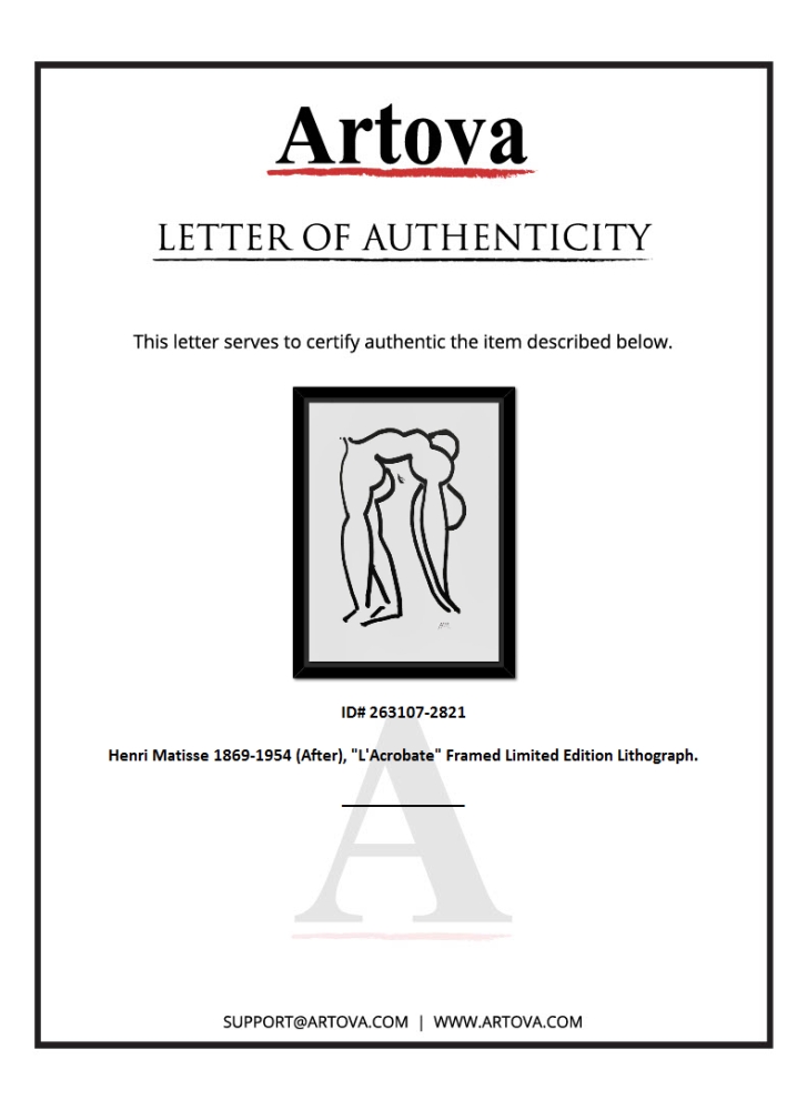 "L'Acrobate" is a limited edition lithograph by Henri Matisse (1869-1954) bearing the plate signature of the artist. This piece comes from an edition of 200 authorized by the Matisse Estate; the edition number is not on the piece itself but on the certificate. This piece comes custom framed. Includes Certificate of Authenticity. Measures approx. 28.5" x 37" (frame), 22.5" x 31" (image).