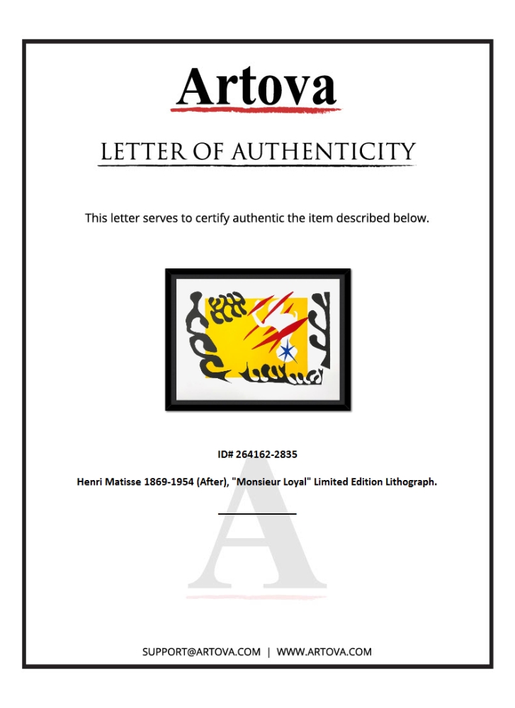"Monsieur Loyal" is a limited edition lithograph by Henri Matisse (1869-1954). This piece comes from an edition of 200 authorized by the Matisse Estate; the edition number is not on the piece itself but on the certificate. This piece comes custom framed. Includes Certificate of Authenticity. Measures approx. 37" x 29" (frame), 31" x 23" (image).